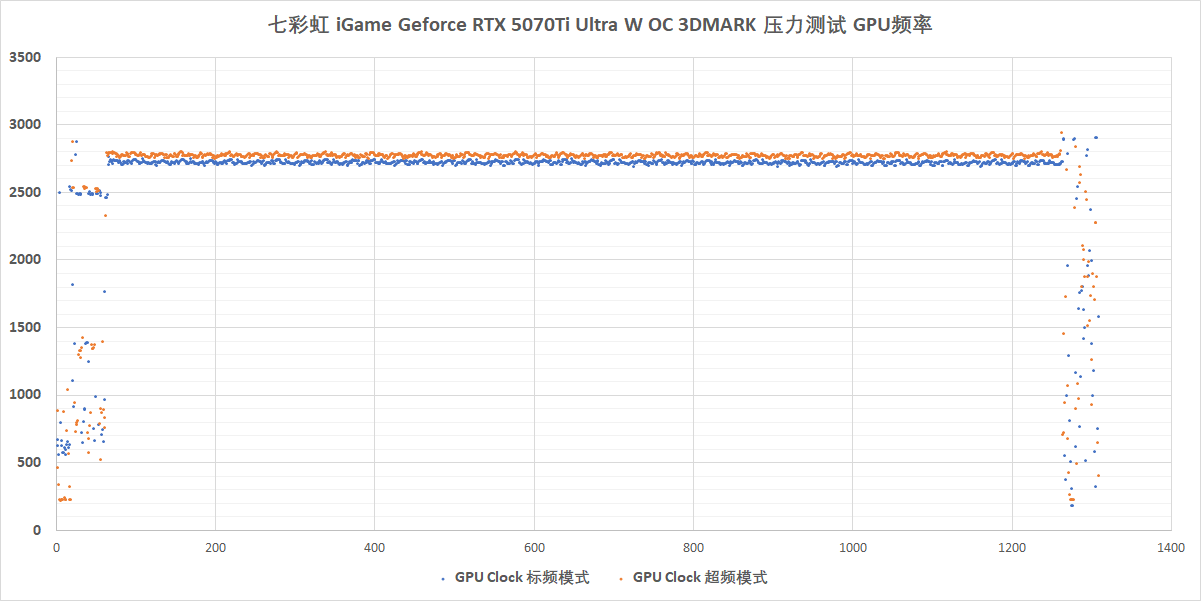 iGame GeForce RTX 5070 Ti Ultra W OC 16GB在一键超频模式下,GPU频率要比标频模式高大约50Mhz基本维持在2700-2800MHz之间