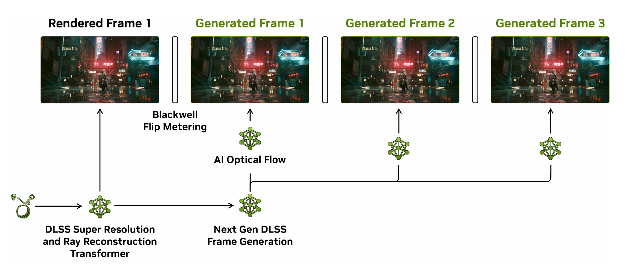 DLSS 4新的帧生成 AI 模型的速度提高了 40%,使用的显存减少了 30%,并且每个模型只需要运行一次渲染帧以生成多个帧。与此同时,NVIDIA使用AI光流模型替代硬件光流加速器来生成光流场,从而避免了硬件光流加速器造成的性能瓶颈。