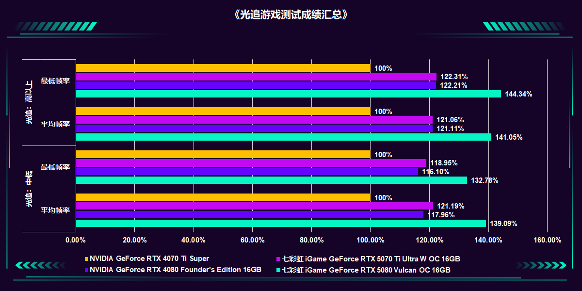 与基准测试呈现出的结果类似,无论是光栅游戏还是光追游戏,iGame GeForce RTX 5070 Ti Ultra W OC 16GB和RTX 4080均杀得难解难分,RTX 5070 Ti在光追方面略高一点点,而光栅方面稍逊一筹,考虑到RTX 4080 SUPER和RTX 4080也并没有什么本质区别,可以说这三款显卡都半斤八两。