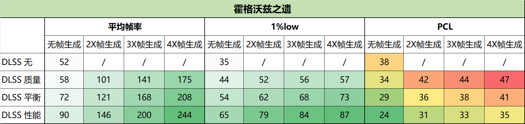 在《霍格沃茨之遗》中,开启多帧生成可以有效提高帧率,对平均帧率的增幅超过300%,而对于1%low的增幅略低,但也超过100%。但是开启帧生成之后PCL会有所增加,帧生成倍率开的越高,延迟也对应升高,但并非线性,幅度不大。