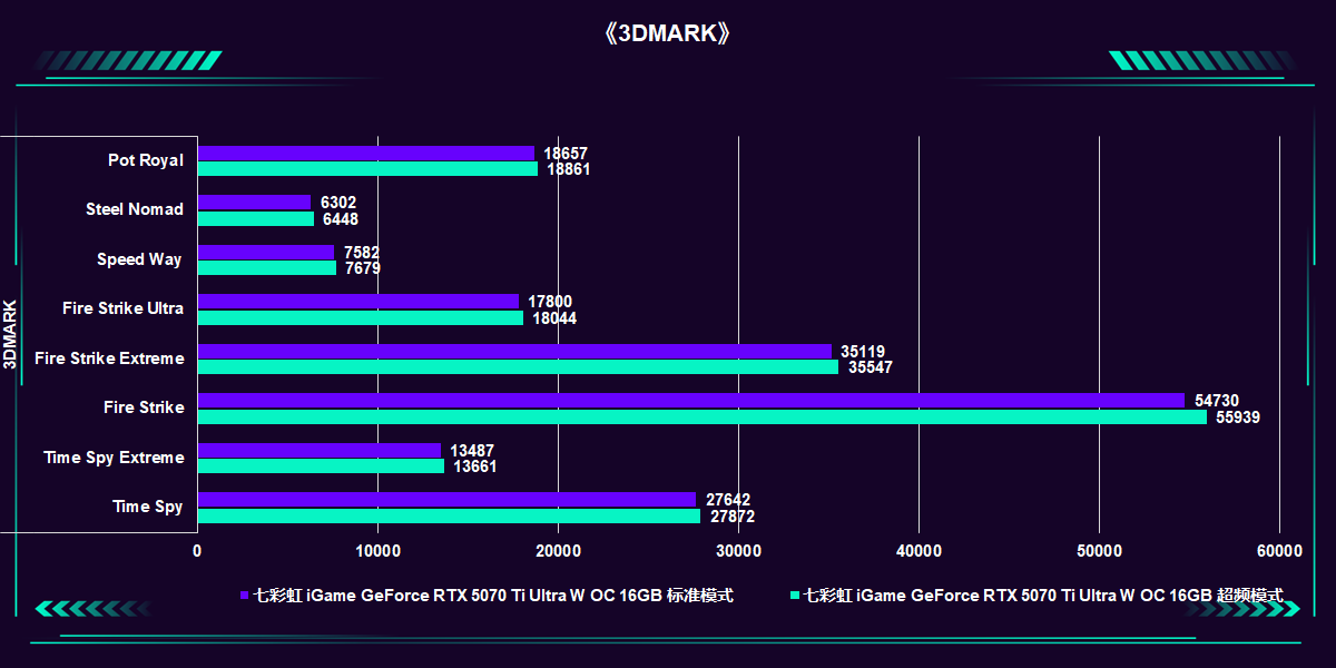 超频后的iGame GeForce RTX 5070 Ti Ultra W OC 16GB性能获得大幅提升,远远甩开RTX 4080不算,在部分3DMARK基准测试项目中甚至可以摸到二哥RTX 5080