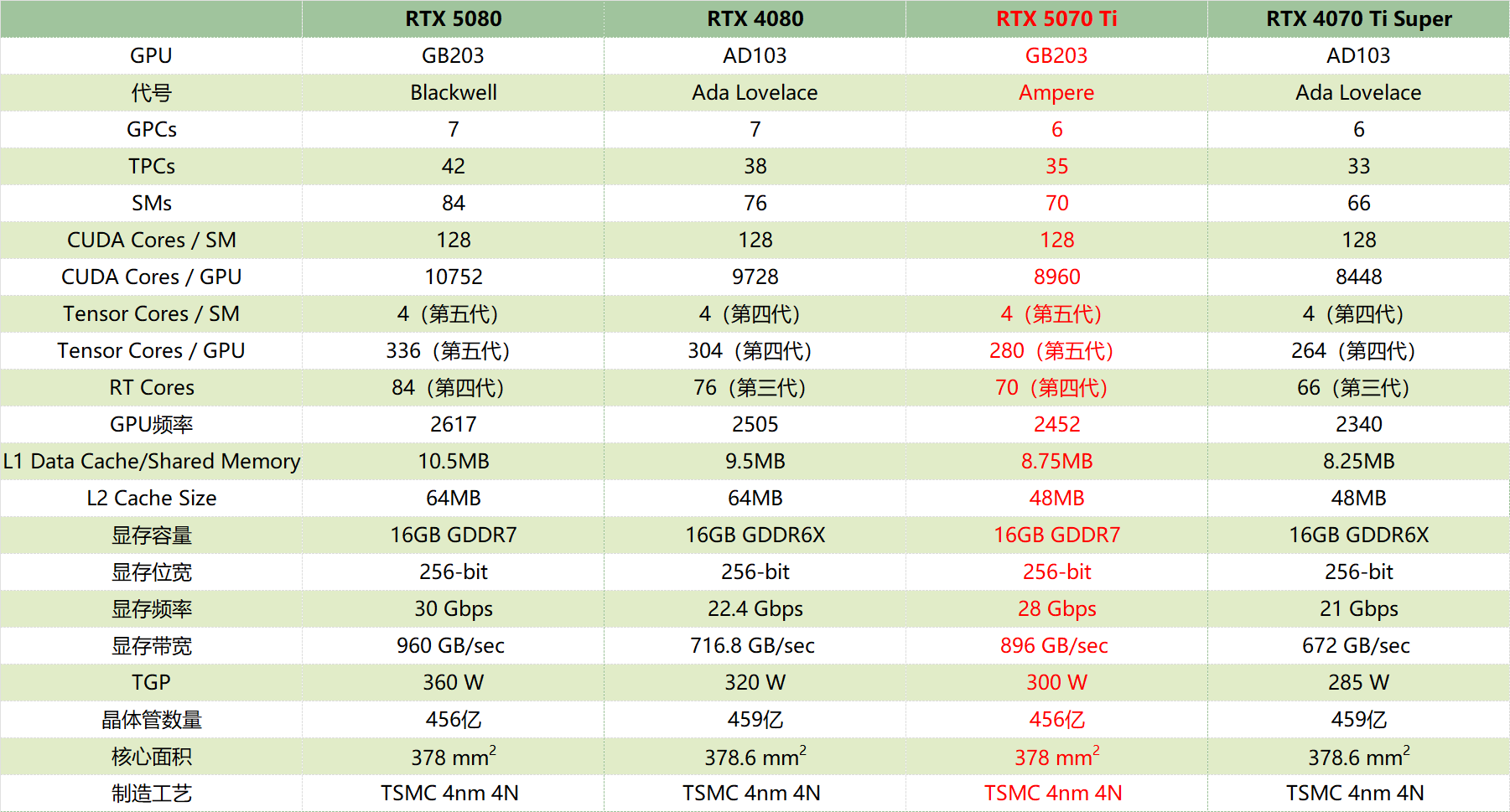 而GeForce RTX 5070 Ti在完整版本的基础上砍掉了整一组GPC,并且在其他规格上也进行了一定程度上的缩减,各种维度的手术做下来,GeForce RTX 5070 Ti在GPU方面总体规格正好是5080的5/6,共包括6组GPC、35组TPCs、70组SMs、48MB的L2 Cache。保留了完整的8组 32-bit 总共256bit显存控制器和16GB GDDR7显存,但显存速度从30Gbps降为28Gbps,带宽也同步降低。即便使用了精简版的GB203,GeForce RTX 5070 Ti相比上一代的GeForce RTX 4070 Ti Super规格方面还是有不小提升的,详见下表: