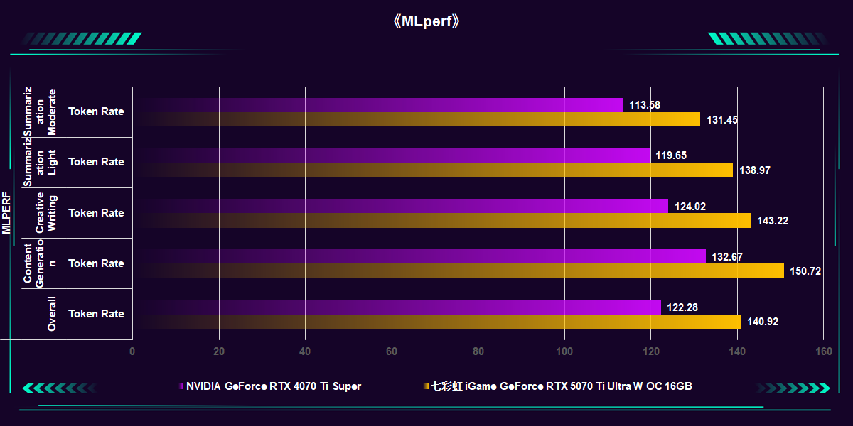 在生产力方面,使用MLperf进行测试,iGame GeForce RTX 5070 Ti Ultra W OC 16GB显著优于RTX 4070 Ti SUPER,领先幅度在15%左右。
