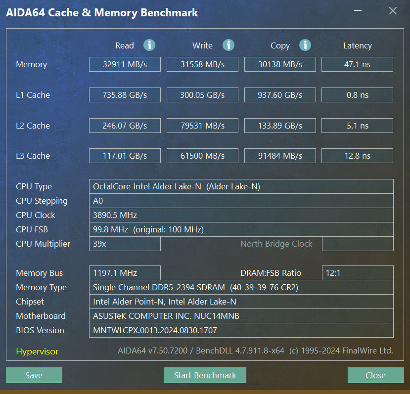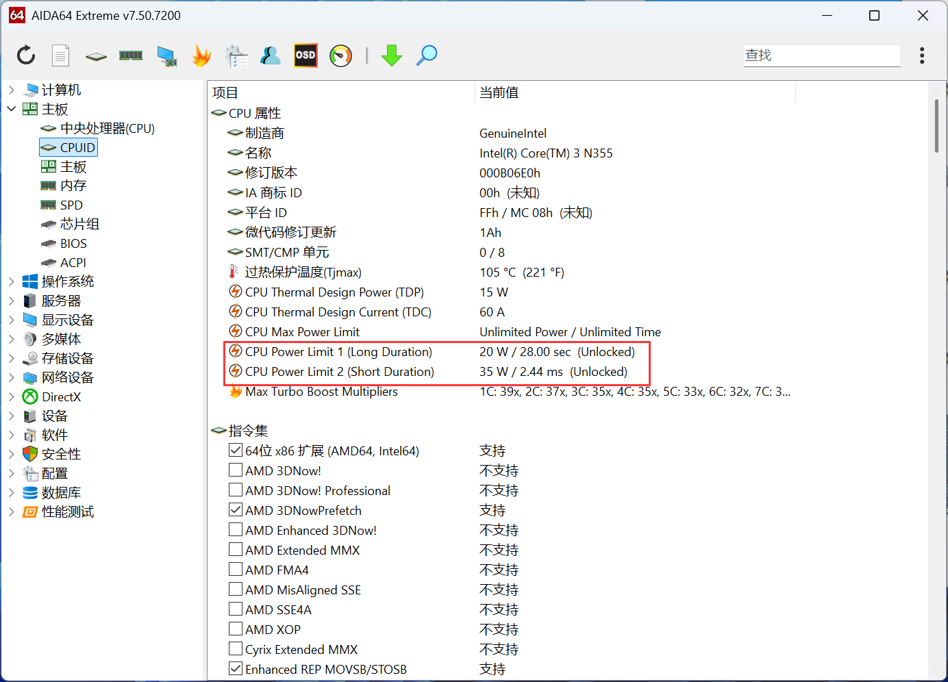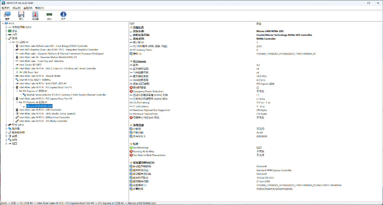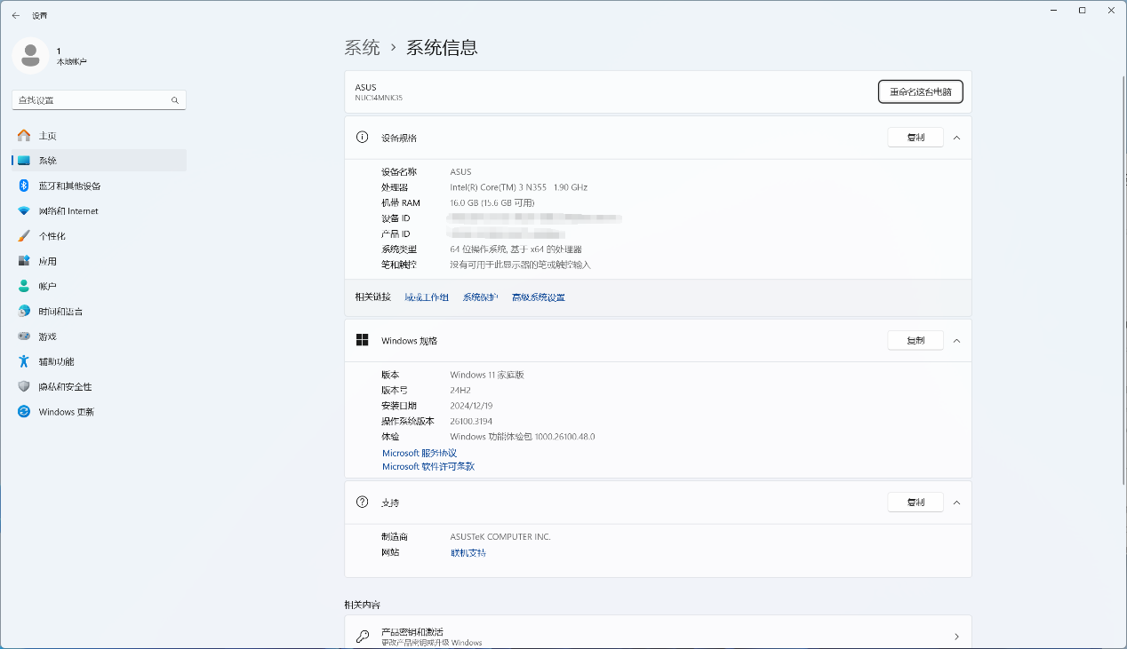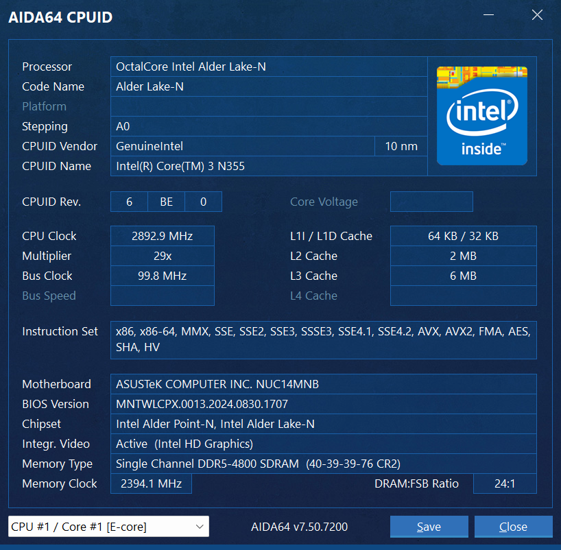 ▲ASUS NUC 14 Elite搭载了Intel N355 CPU,内存容量为16G(单通道)。预装系统是正版Windows 11 24H2家庭版 ▲设备管理器信息,CPU是Intel N355 八核心八线程,无线网卡为AX211 ▲AIDA64信息,CPU的PL1为20W,PL2为35W ▲CPU ID ▲PCIe通道分布信息性能测试