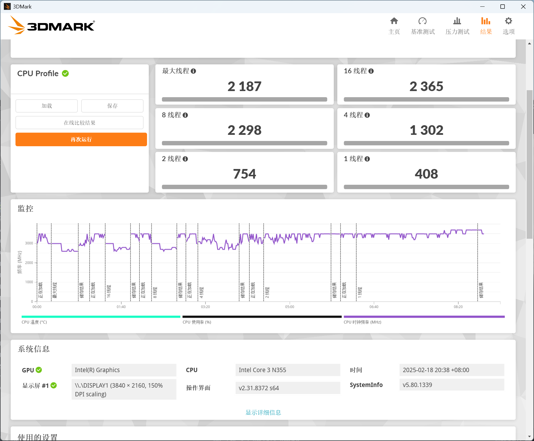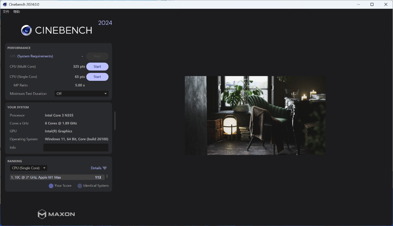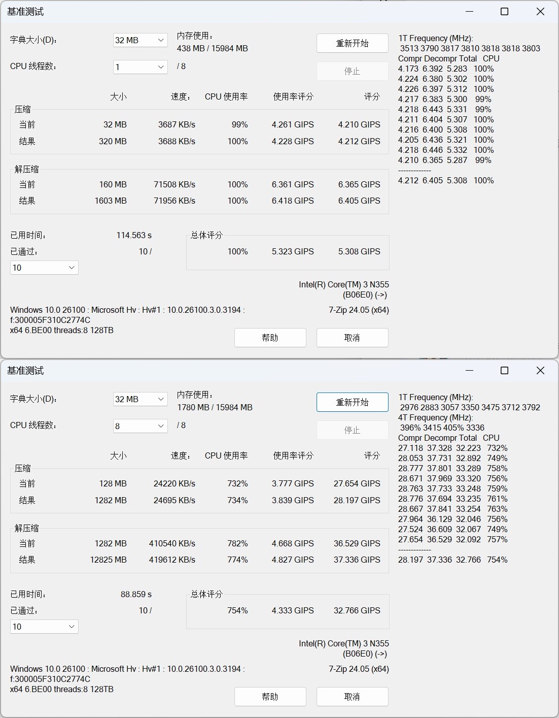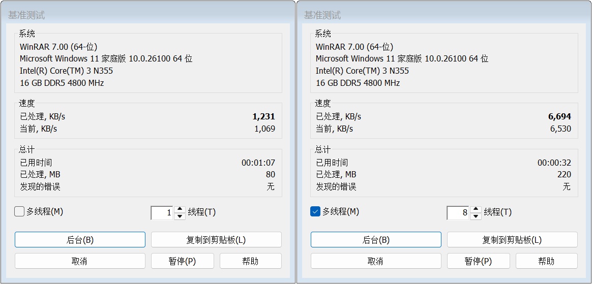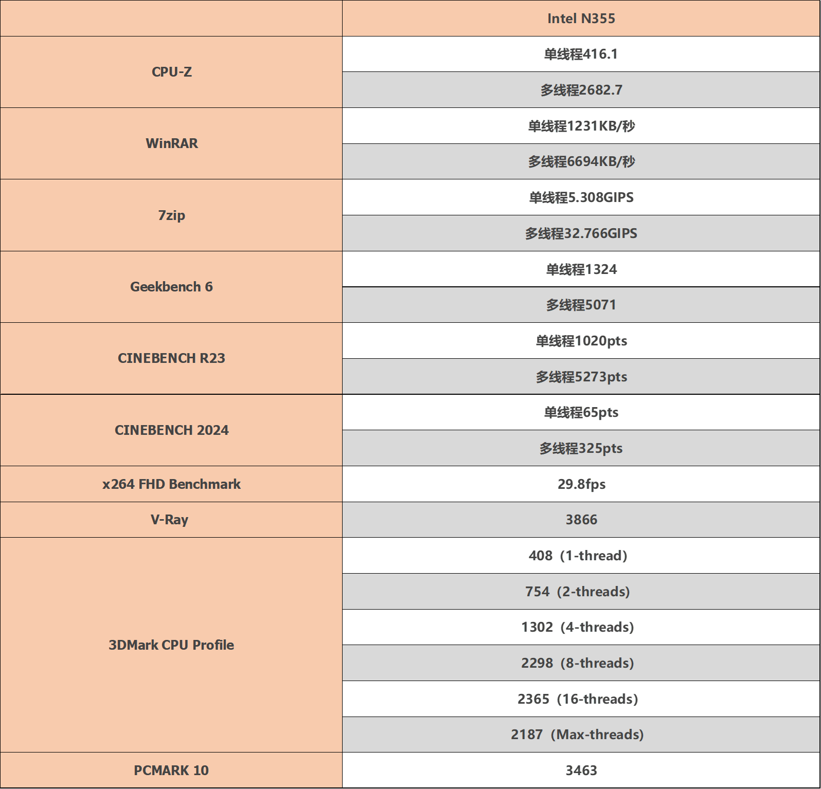▲CPU-Z测试分数;单线程372.2,多线程1280.0 ▲WINRAR 7.00单线程和多线程测试 ▲7-Zip 24.05单线程和多线程测试 ▲Geekbench 6测试,单核心分数为1324,多核心分数为5071 ▲CINEBENCH R23测试,单核心分数为1020pts,多核心分数为5273pts ▲CINEBENCH 2024测试,单核心分数为65pts,多核心分数为325pts ▲V-Ray Benchmark得分3866 ▲x264 FHD Benchmark,x264视频编码测试程序。Intel N355每秒可渲染29.8帧 ▲3DMark CPU Profile测试,可以测试CPU在不同线程下的性能表现 ▲PCMARK 10分数3463;常用基本功能得分6222,生产力得分4504,数位内容创作得分4024 ▲数据汇总综合以上测试结果,Intel N355是一款在多线程任务中表现较好的CPU,特别是在压缩、渲染和多任务处理方面。然而,其单线程性能相对较弱,对于需要高性能单线程处理的应用可能不太适合。总体而言,这款CPU适合对多线程性能有一定需求,但预算有限的用户