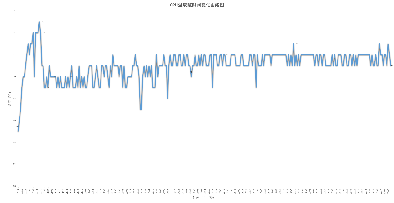 • 温度:不超过75°C,散热系统高效,CPU工作在安全的温度范围内