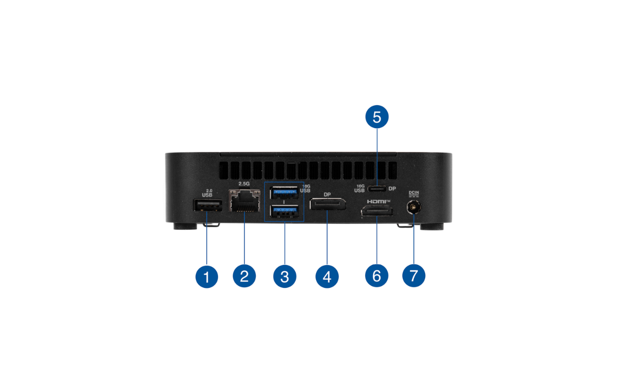 ▲侧面Kensington锁设计为公共场景提供物理防盗保障 ▲NUC14 Elite背部接口极为丰富,支持最多3个显示屏的连接,通过HDMI 2.1、DisplayPort 1.4等接口,用户可以轻松实现多屏扩展,提升工作效率1.USB 2.0 Type-A
