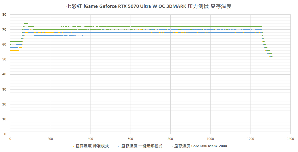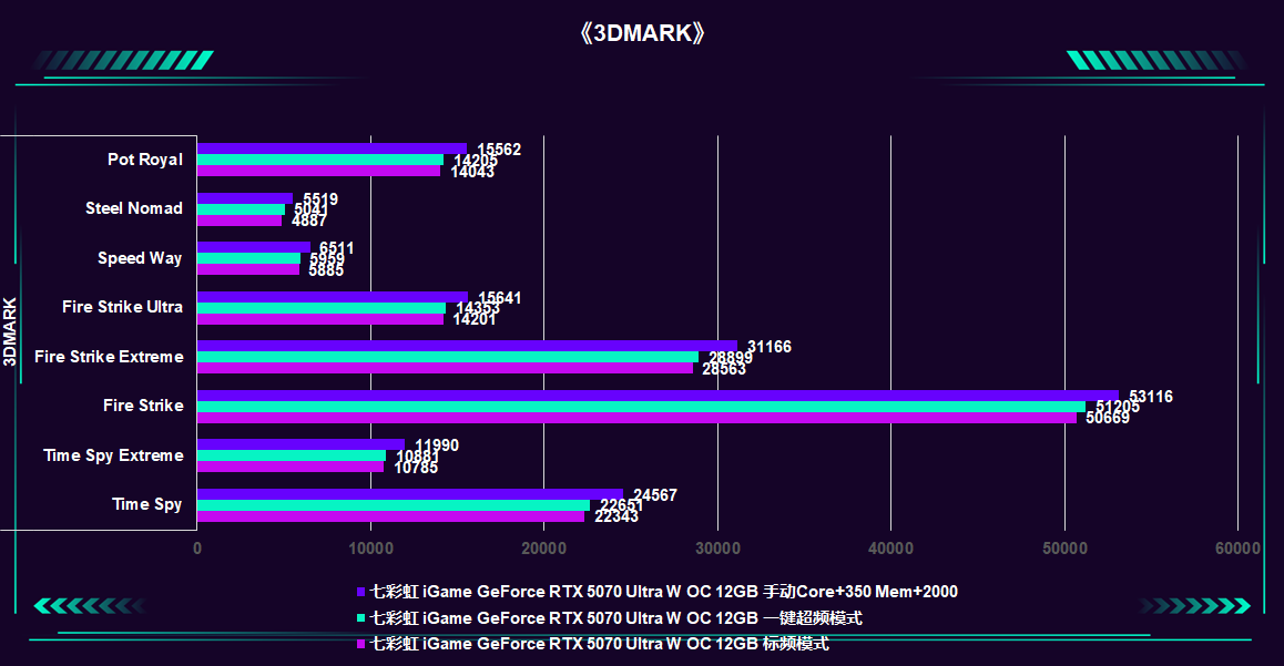 经过实测,我手里这片七彩虹iGame GeForce RTX 5070 Ultra W OC 12GB显卡可以在Core + 350MHz,显存 + 2000MHz的情况完成全部测试,在3Dmark的基准测试中获得明显提升,相比默认情况的提升幅度在10%左右。