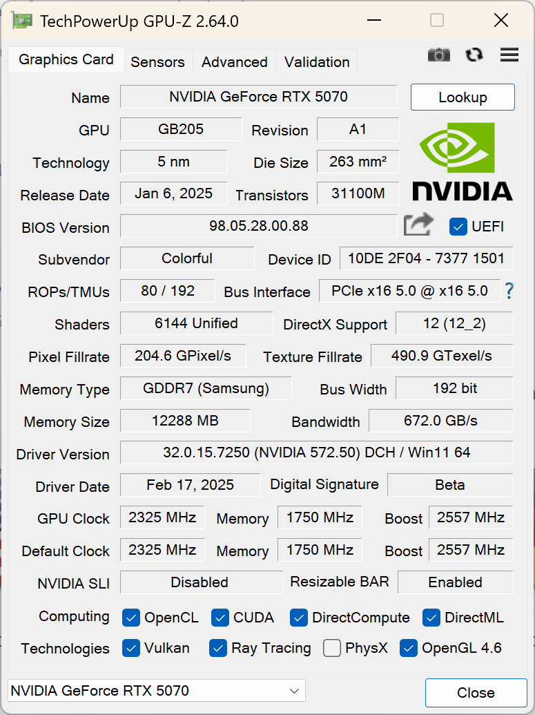 之前的RTX 5090 D使用了GB202 GPU,而RTX 5080和RTX 5070 Ti使用的则是GB203 GPU,这次的RTX 5070使用了一款新的GPU:GB205。完整规格的GB205共包含5组GPC,25 组TPC,50组SM,6400个CUDA Cores,50个RT Cores,200个Tensor Cores,200个纹理单元,80个ROPS, 6组32bit的显存控制器(总计192bit),总共耗费311亿晶体管