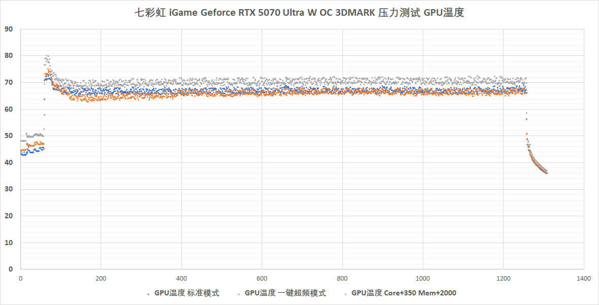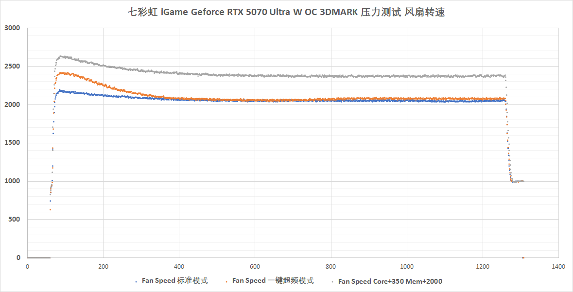 七彩虹iGame GeForce RTX 5070 Ultra W OC 12GB显卡体积缩小,散热规模也同步变小,为了维持较低的温度就需要更高的风扇转速,标准模式和一键超频模式的风扇速度基本稳定在2000RPM,而手动超频时可达2400RPM,噪声相比默认模式还是有所提高的
