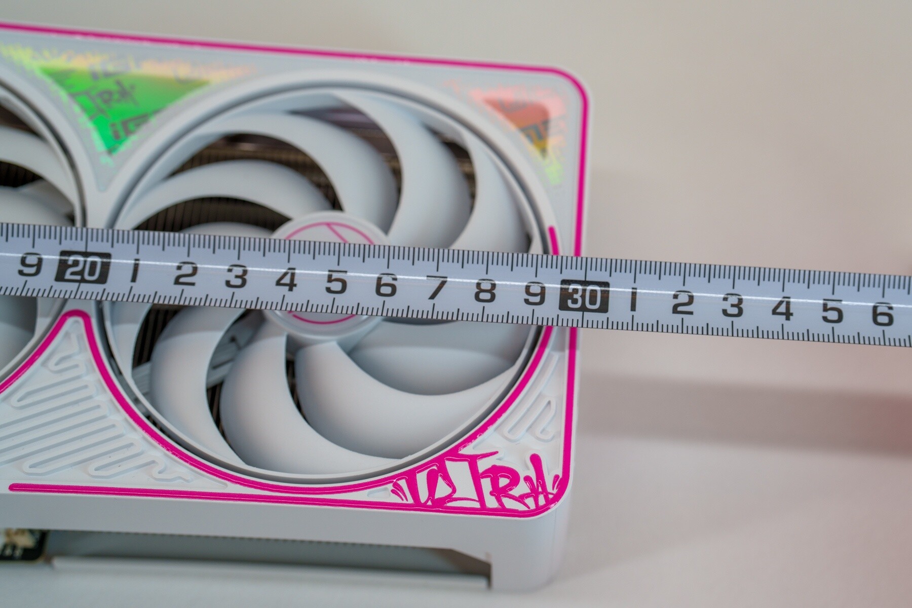 尺寸方面比先前的RTX 5080/5070 Ti要小了整整一圈,长约30cm(不含挡板),高约10cm(不含PCI-E接口部分),厚度为5cm(2.5槽),符合NVIDIA的SFF-READY标准,适合紧凑型机箱的安装