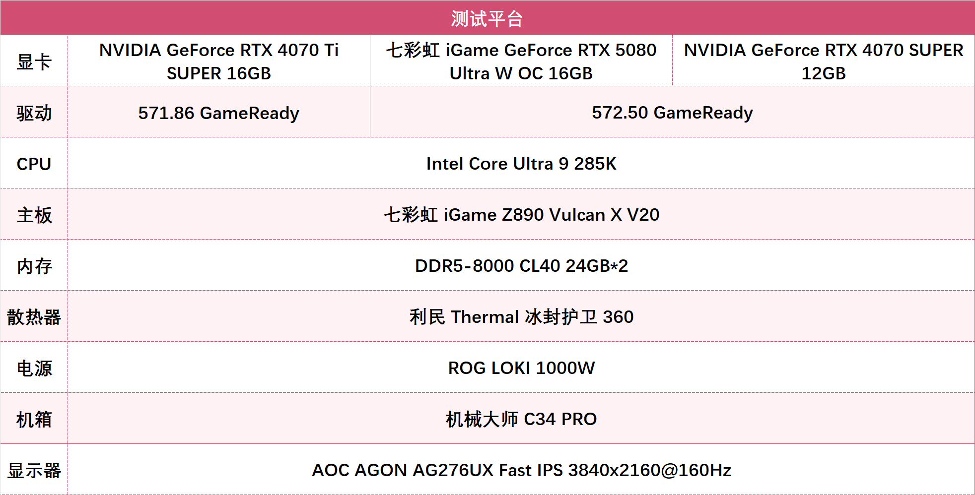 这次七彩虹 iGame GeForce RTX 5070 Ultra W OC 12GB显卡的性能测试,延续我们以往的测试平台,Intel Core Ultra 9 285K搭配iGame Z890 Vulcan,显示器则是AOC AGON AG276UX具体如下: