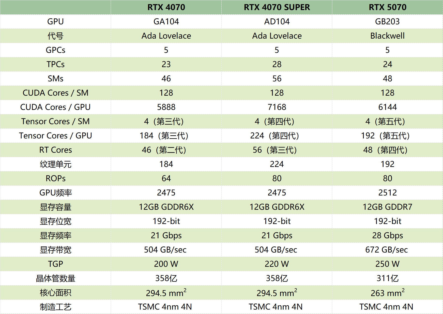 从规格上来看,RTX 5070比RTX 4070略高,而仅有RTX 4070 SUPER的85.7%。