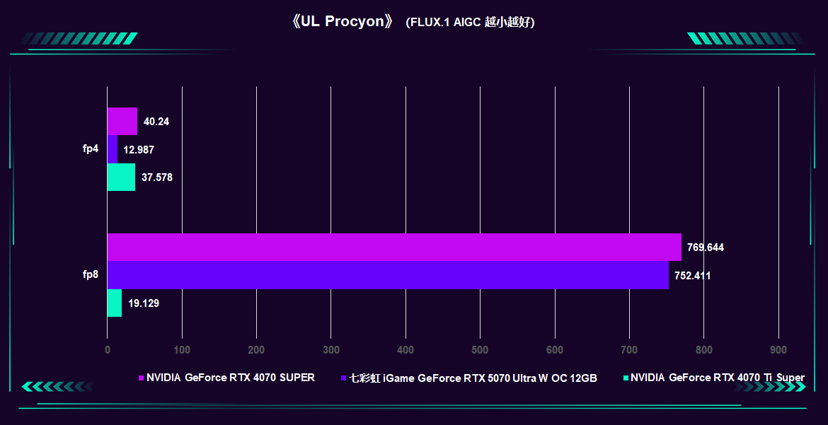 值得一提的是,在UL Procyon的AIGC测试中,得益于Blackwell具备的FP4精度优化,使得RTX 5070在FP4精度测试中大幅RTX 4070 SUPER,这对于想要低成本运行AIGC用户来讲无疑是一个福音。