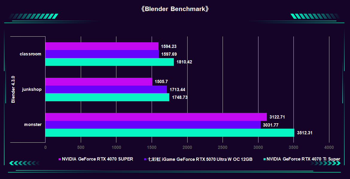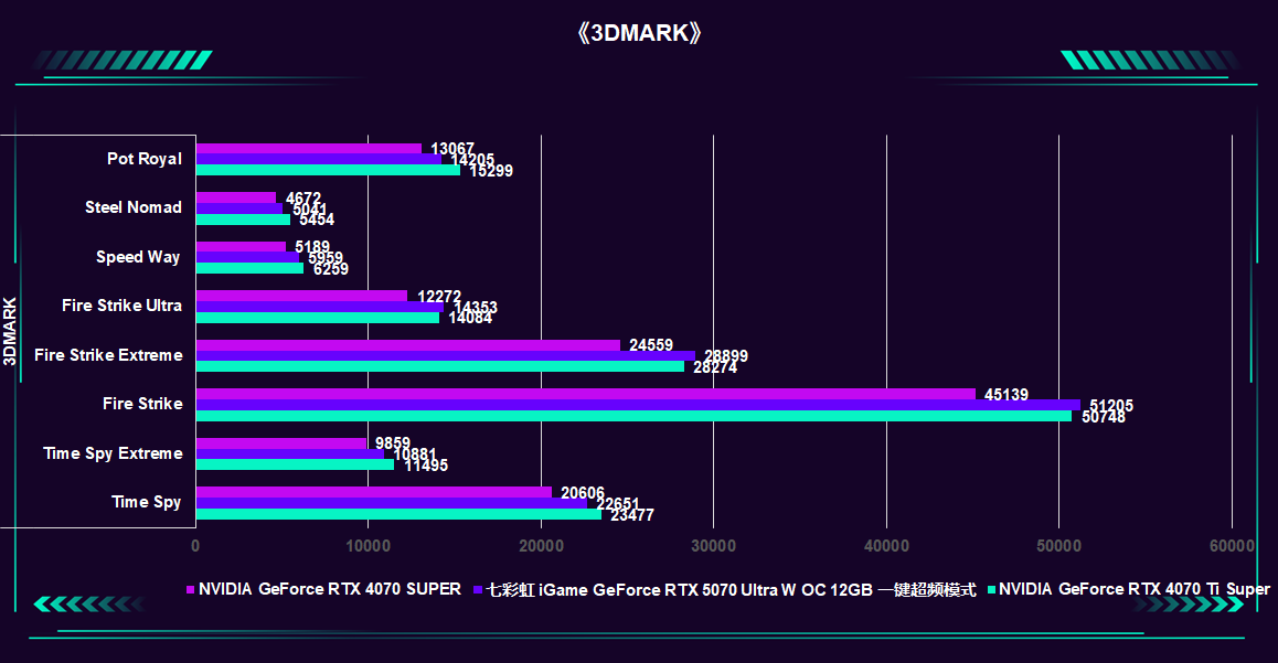 所有测试在开启显卡的一键超频功能下进行,通过3D Mark基准测试可以看得出来,iGame GeForce RTX 5070 Ultra W OC 12GB显卡相比上一代的RTX 4070 SUPER还是有一定优势的。