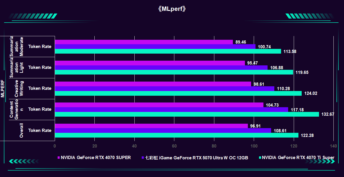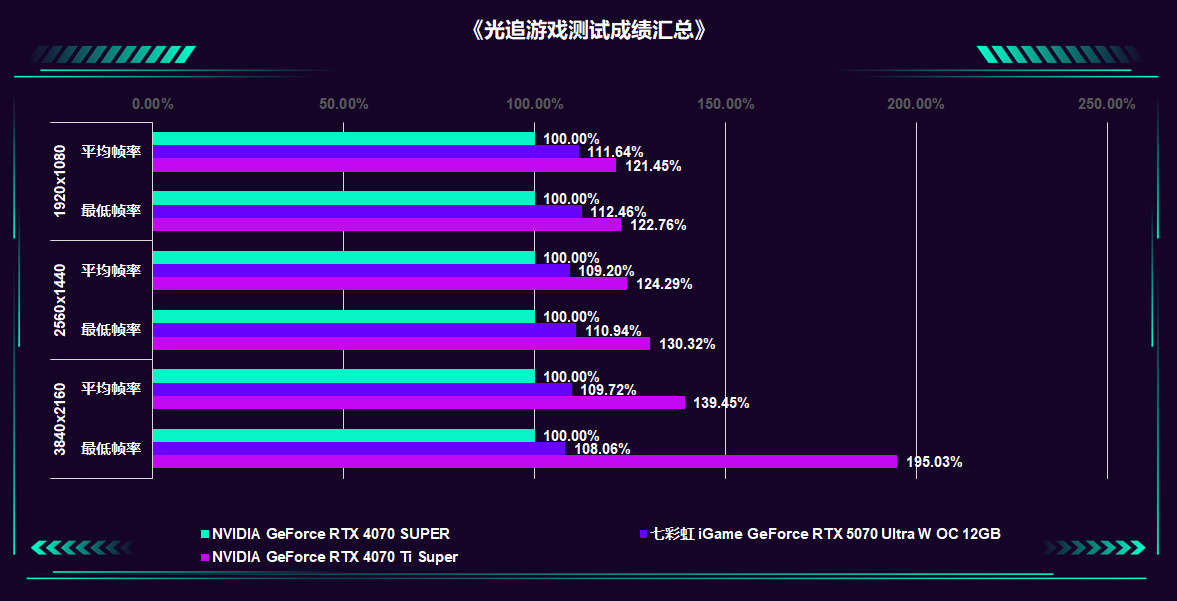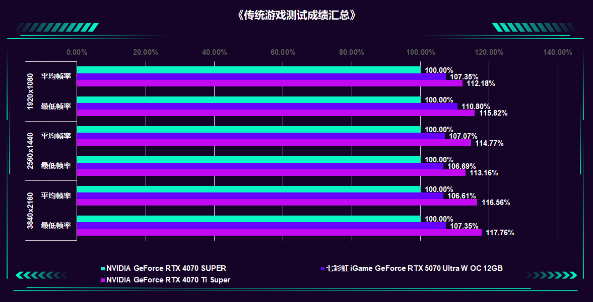 在传统光栅游戏方面,iGame GeForce RTX 5070 Ultra W OC 12GB显卡相比RTX 4070 SUPER有着一定的优势,在2K分辨率的游戏基本都能超过100帧,4K分辨率除个别游戏外也大部分可以维持在60帧。