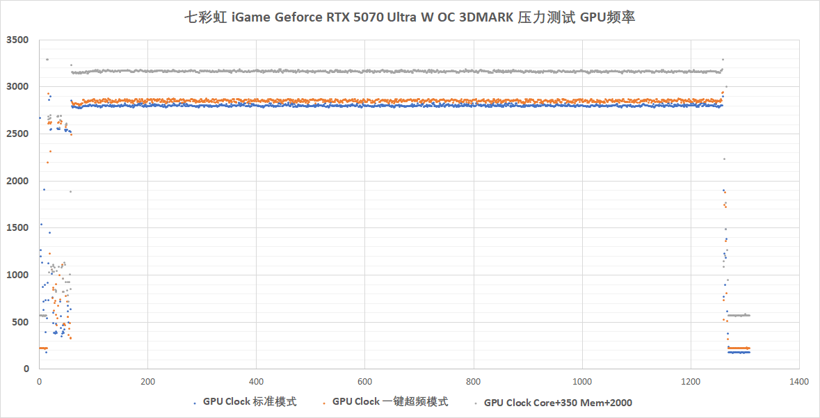 默认情况下,七彩虹iGame GeForce RTX 5070 Ultra W OC 12GB显卡的GPU频率可以稳定在2700MHz左右,按下一键超频按钮后可提升大约50Mhz,但在手动超频下可以超过3100Mhz