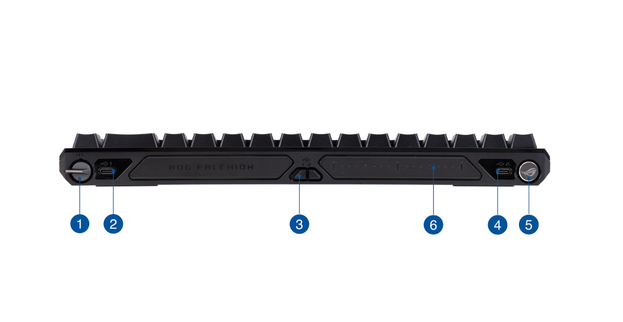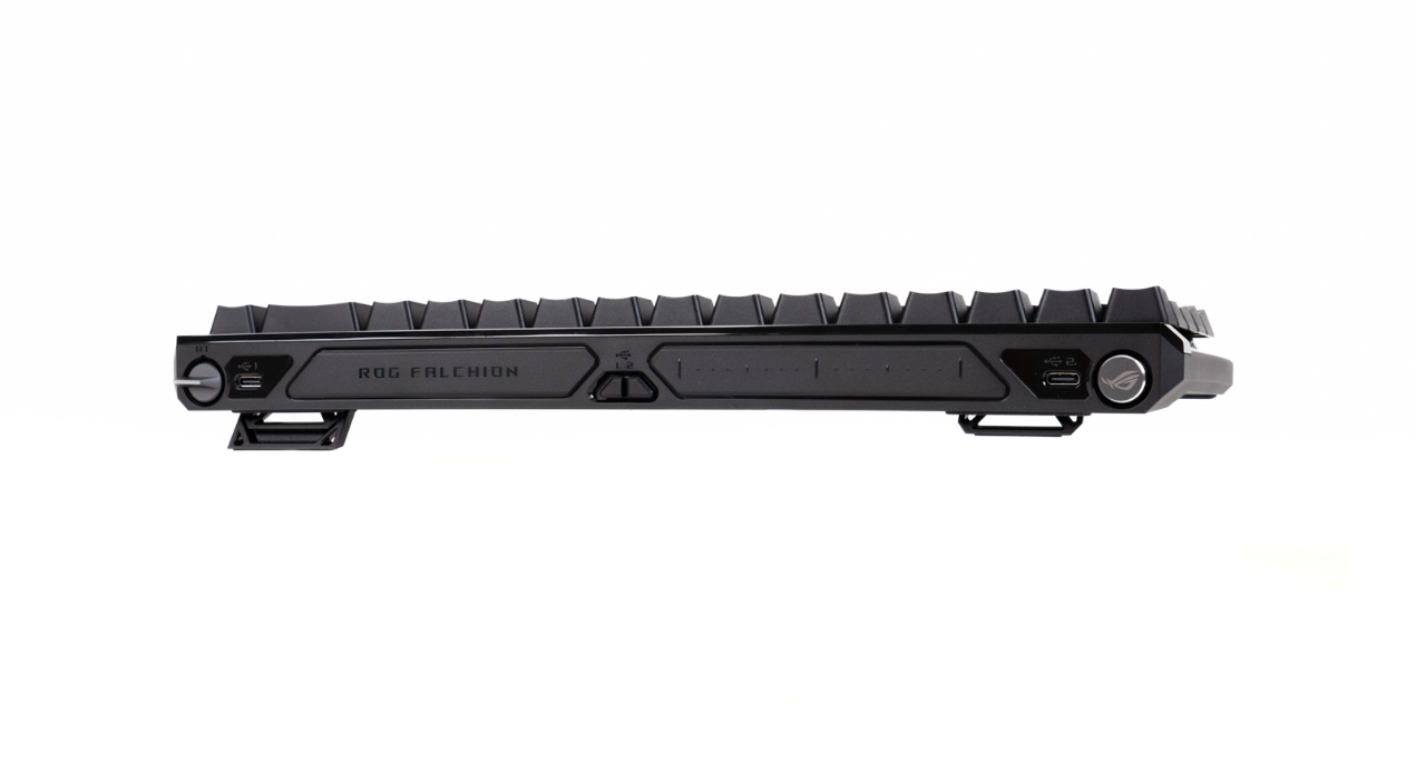 ▲ROG龙鳞ACE mini无线游戏鼠标尺寸为117x57x37mm,不带USB接收器时重量仅49.9克,实现了轻量化设计,适合中小手型玩家长时间使用 ▲滚轮部分在工作时会亮起RGB灯光,色彩丰富且过渡自然,玩家可以通过Armoury Crate软件对灯光效果进行个性化设定,展现出独特的风格和电竞氛围 ▲ROG魔导士ACE HFX磁轴电竞键盘附件一览;左侧为键盘本体,采用黑色PBT键帽,键位布局紧凑合理,能够为用户提供舒适的打字体验。中间的键盘盖采用坚固的塑料材质,内部印有“REPUBLIC OF GAMERS”等字样,彰显品牌特色,同时也能有效保护键盘内部结构,防止灰尘和杂物进入。右侧的连接线采用USB type A to C 编织线,线长适中,能够满足不同用户的需求,确保信号传输稳定可靠。ROG 键帽起子能够安全地拔出机械键盘上的键帽,避免直接用手拔键可能造成的键帽损坏或轴体损伤,拔下键帽后,可以更方便地清洁键盘内部的灰尘和杂物以及更换新键帽,保持键盘的清洁和良好的工作状态 ▲ROG魔导士 Ace HFX 电竞键盘采用 65% 紧凑布局,小巧高颜值。鼠标移动空间增大,桌面更整洁,美观实用兼具。ROG PBT 双色透光键帽提供优质手感及持久耐用性。按键设计经过优化,采用中等高度键帽和较短的键杆,可减少按键晃动,提供更舒适的使用体验 ▲ROG HFX磁轴采用POM轴心+PC上盖。ROG HFX 磁轴的总行程为4.0 mm,初始压力40 gf,触发压力55 gf,可调节0.1-4.0mm触发行程,游戏激战时可迅速调整触发行程,实现更快速的响应和更精准的控制。PC材质上盖与轴芯接触处进行抛光处理,确保顺滑触感。轴芯材质由低摩擦系数的复合POM材料制成,敲击平稳顺畅。双侧墙设计增强了按键的稳定性,减少晃动并防止灰尘进入 ▲ROG 魔导士 Ace HFX 键盘拥有精心设计的两对不同高度的键盘脚,能够提供三种符合人体工程学的倾斜角度,确保用户在长时间使用时能够获得最佳的舒适度和支撑,有效减少手腕疲劳,提升打字体验 ▲ROG 魔导士 Ace HFX 键盘在设计上充分考虑了用户的连接需求和使用便利性。其后板两侧各配备了两个 USB-C 接口,这种布局不仅使得连接更加灵活,还能让桌面设置更加整洁有序。用户可以轻松地将多个设备连接到键盘上,并且能够快速在两台 PC 之间进行切换,极大地提高了工作效率和使用的便捷性1.触发模式切换开关(HFX磁力开关在向上移动时立即复位,游戏响应更快,操作更高效)
