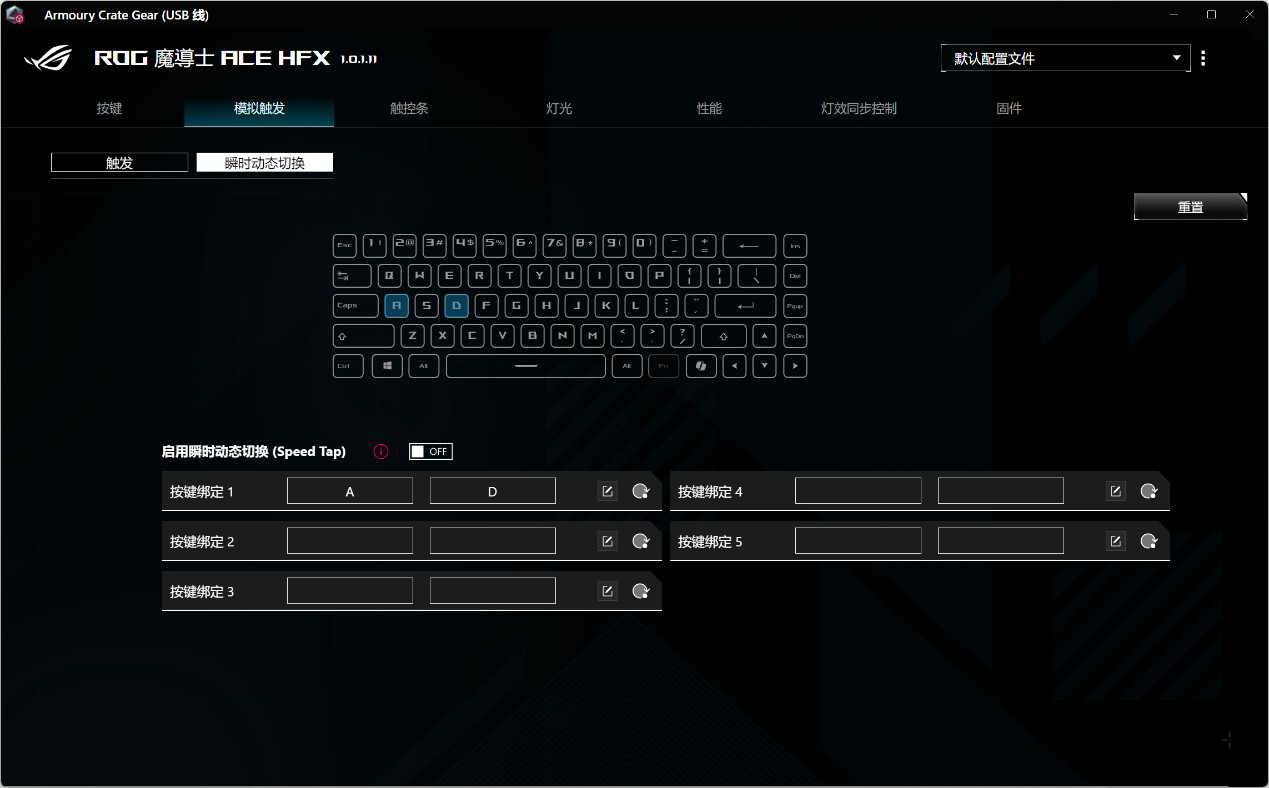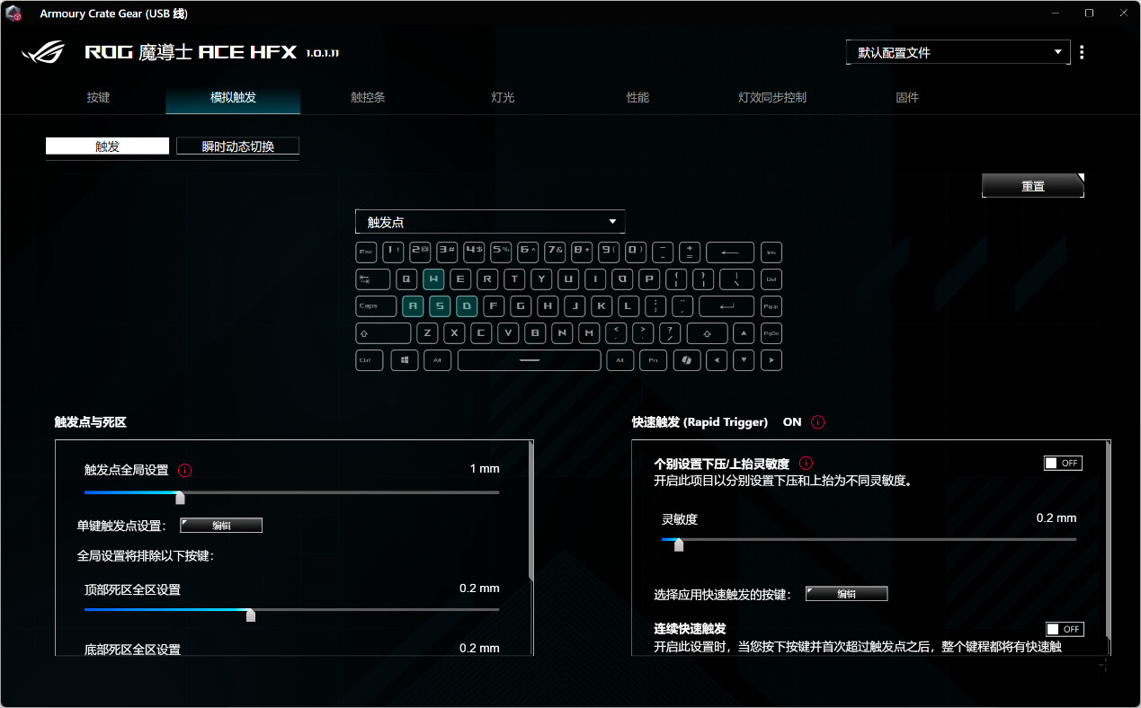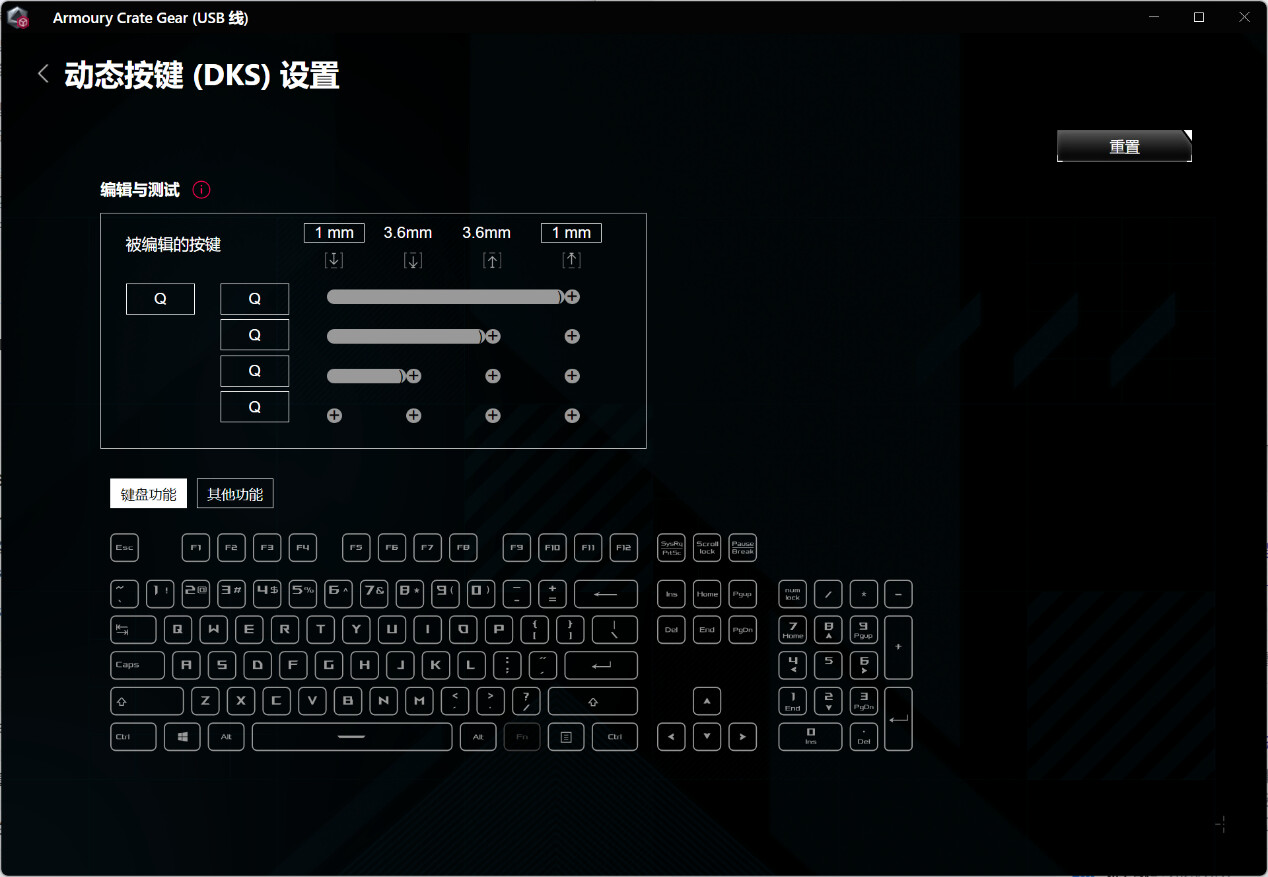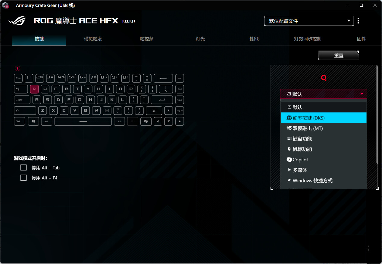 ▲进入软件后会提示更新固件,首先将固件更新至最新以获取最新功能 ▲在“按键”选项卡中,用户可以为键盘上的每个按键分配不同的功能,例如可以对选中的按键设为动态按键(DKS);进行游戏时可以启用或停用特定的快捷键组合,如“停用 Alt + Tab”和“停用 Alt + F4” ▲在磁轴键盘中,DKS动态键程允许用户在按压一个按键时,根据按压的深度或程度不同,触发不同的按键功能。例如,用户可以设置一个按键在轻按时触发一种功能,而在完全按下时触发另一种功能。这种功能在游戏场景中非常有用,比如可以实现一键反向急停等操作 ▲在模拟触发这个选项中,用户可以对华硕键盘的触发机制进行高度自定义的设置,以优化键盘在游戏或其他高精度操作中的表现。用户可以根据个人偏好调整触发点和死区,以及启用快速触发功能来提升按键响应速度和准确性 ▲瞬时动态切换(Speed Tap)允许用户在按下两个指定按键时,系统会优先处理最后一个按键的输入并自动释放之前的按键。这种功能在需要快速响应的场景中非常有用,比如在FPS游戏中,玩家可以快速切换方向或执行其他操作,而无需手动释放之前的按键优势