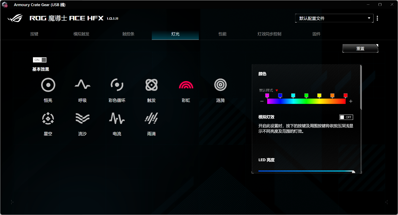 用户可以通过滑动“LED亮度”滑块来调整键盘背光的亮度,从最低到最高进行调节