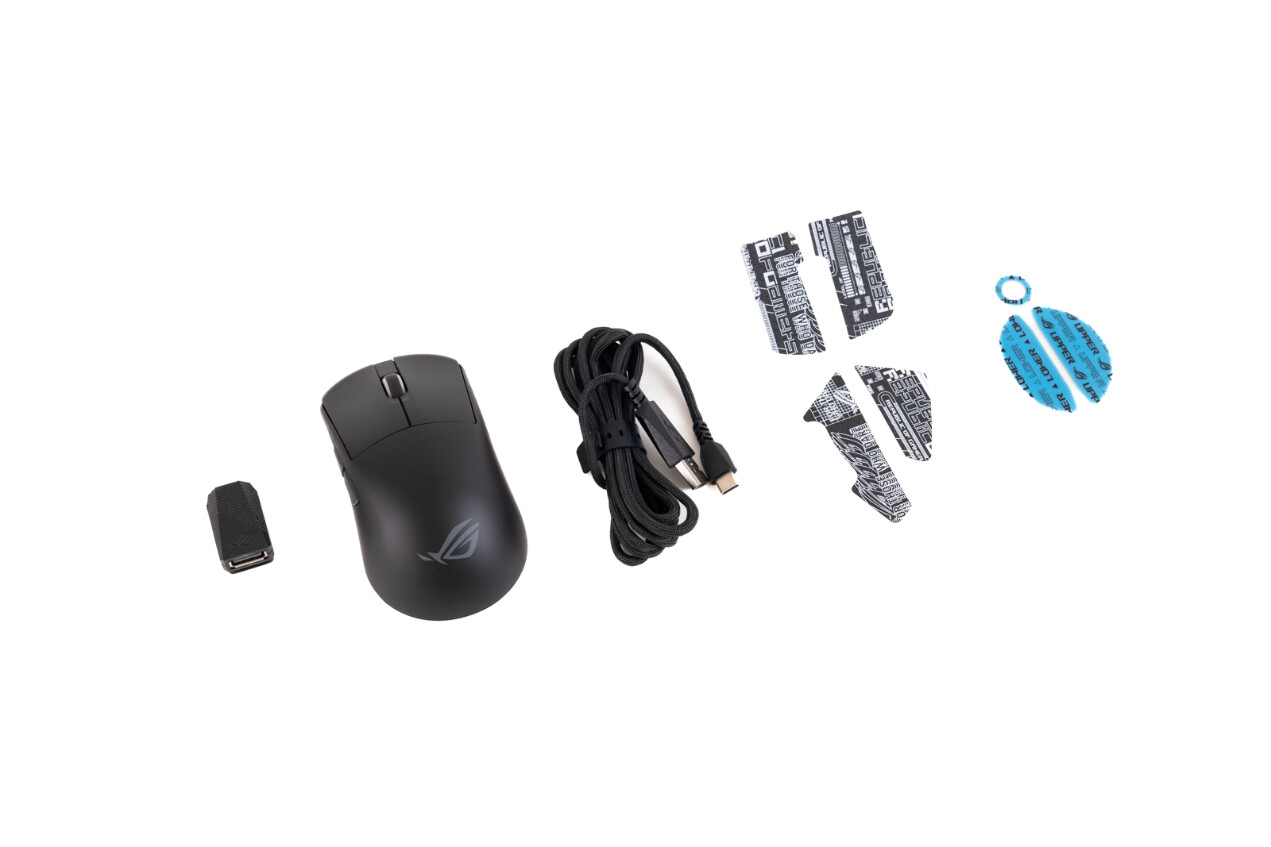 ▲ROG龙鳞ACE mini无线游戏鼠标所有附件一览;鼠标左侧有一个小型的黑色USB 延长器,用于无线连接。鼠标右侧有一根2m ROG 伞绳线(USB-A to USB-C),用于充电或有线连接。此外,还有一些防滑贴和PTFE 替换脚贴,防滑贴可以增强握持手感,而更换鼠标底部的贴片,可以适应不同的使用习惯或表面材质 ▲ROG龙鳞ACE mini无线游戏鼠标外壳采用环保生物基尼龙材质,表面配备全新的光滑涂层,这种涂层不仅赋予鼠标更高质感的外观和优秀的抓握感,还具有干净与哑光质感;除了防滑,还具有不沾汗渍和油污的特性 ▲ROG龙鳞ACE mini无线游戏鼠标搭载了ROG SpeedNova无线连接技术,更低延迟,更可靠连接,更长续航,2.4GHz模式下续航时间可以达到105小时;采用了对称设计,适合左右手使用,缩短了左右按键,提升了中小手型玩家的点击舒适度,背部稍降,更加适合中小手的抓握和指握风格。 ▲鼠标左侧设计了两个可自定义按键,右侧配有ROG字符以及斜条纹防滑纹理,分体式按键更易点击,点击手感清脆 ▲鼠标顶部是USB-C数据接口,用于给鼠标充电或有线连接。左右按键下是ROG全新光学微动开关,光速响应即刻触发,确保即时响应无延迟。无物理接触设计,信号精准无误,告别抖动与误触,游戏操作更流畅 ▲ROG龙鳞ACE mini无线游戏鼠标搭载全新42,000-dpi的ROG AimPoint Pro光学传感器,追踪偏差远低于行业标准,具有100-42,000 DPI及小于1%的偏差值,兼容于各种表面,最大速度750 IPS,加速度50g,可稳定精准地响应每次操作,让游戏创作更尽兴1.DPI 按钮