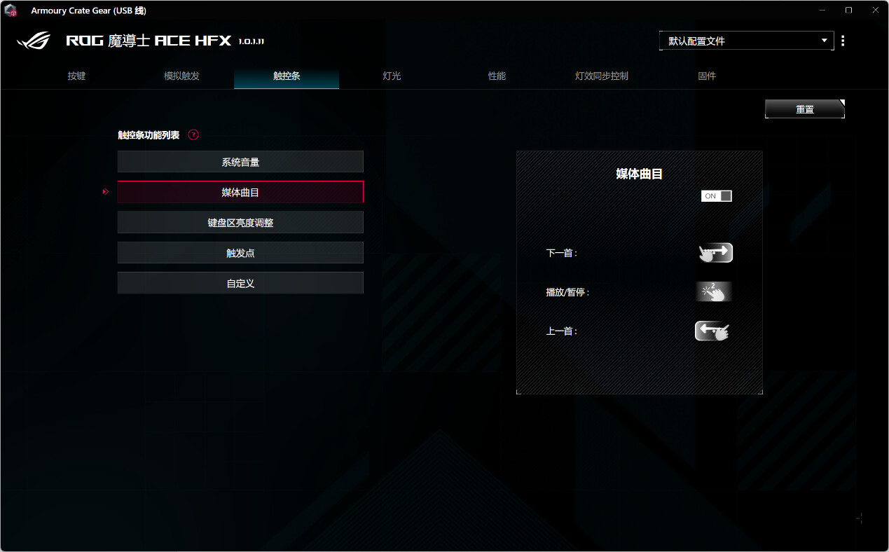 当前设为媒体曲目功能,当选择“媒体曲目”功能时,用户可以设置触控条来控制媒体播放