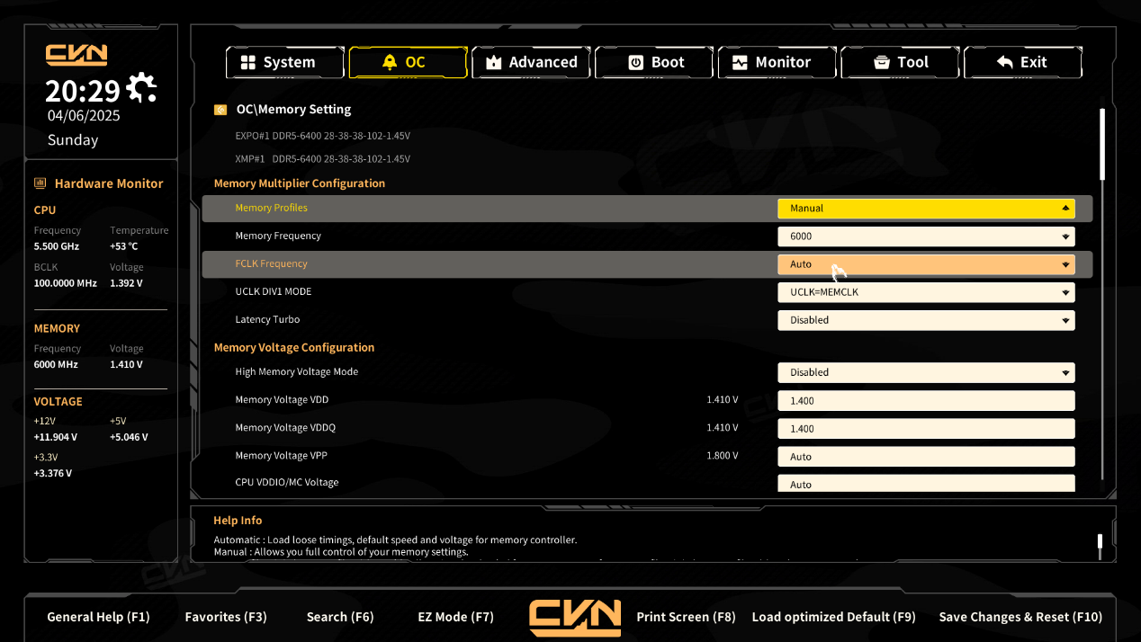 - Memory Profiles:选择内存运行模式。加载内存的默认参数XMP/EXPO。这里选择Manual:手动调整内存频率、延迟和电压