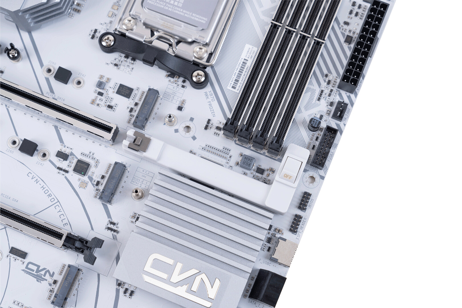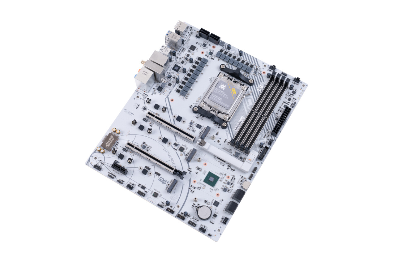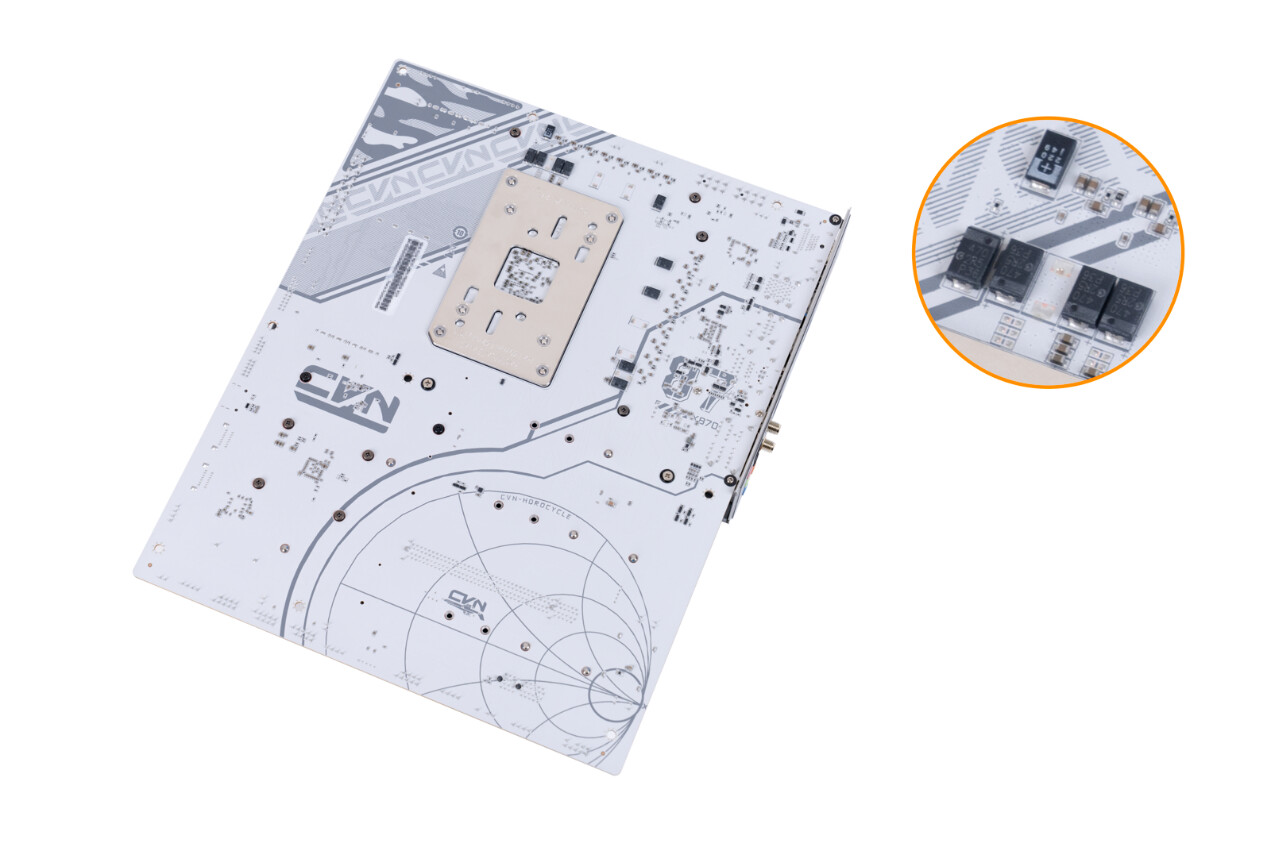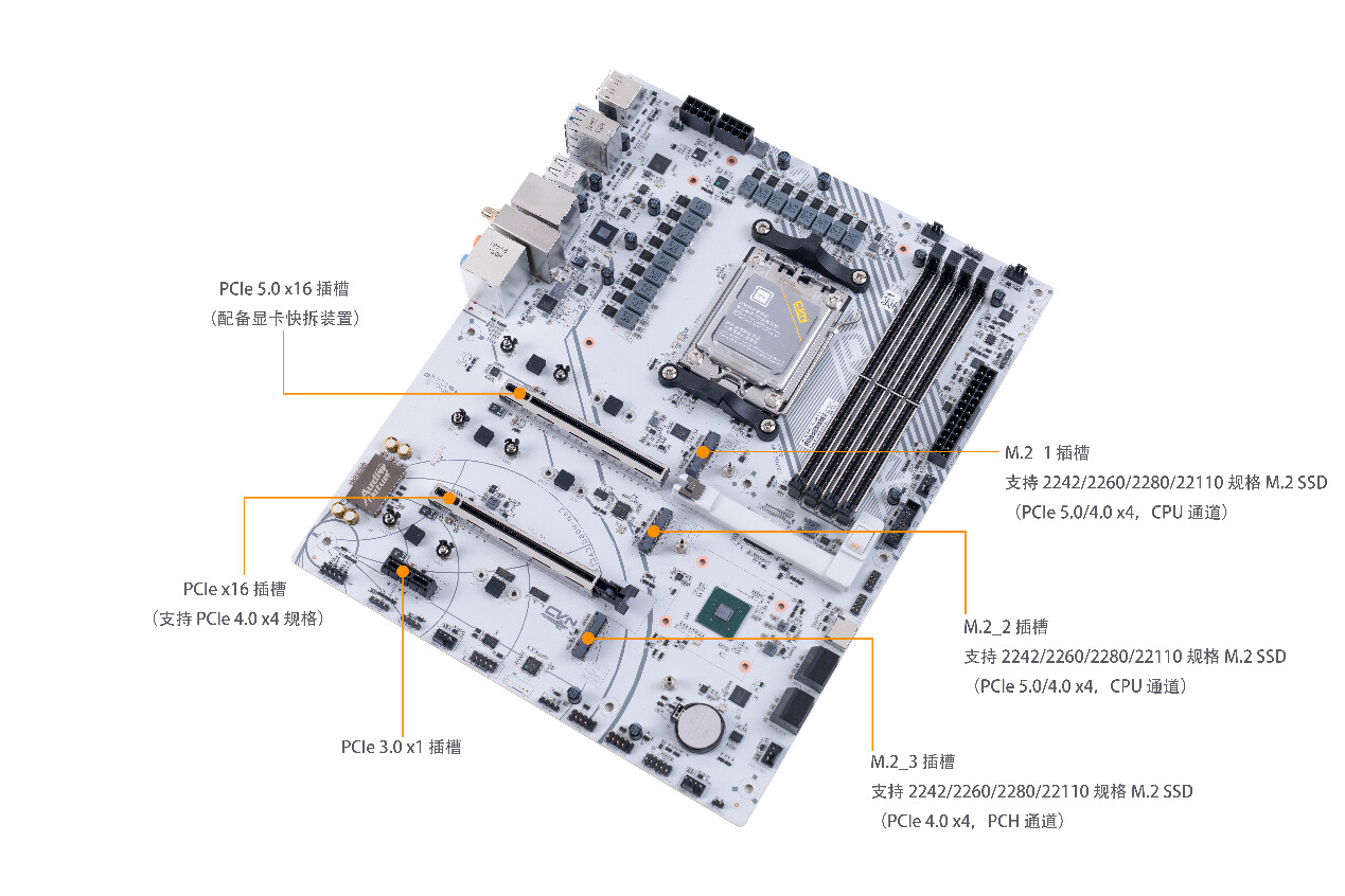 ▲包装盒采用白色和橙色的配色,展示了主板的外观和一些关键特性 ▲CVN X870 ARK FROZEN V14方舟主板尺寸为305mm x 245mm,浅灰色的PCB搭配钛灰色寒霜散热装甲,视觉上呈现出冷酷的工业美学。散热马甲内侧使用CNC工艺切割出CVN冰片复合沟槽,不仅增强了散热效率,更彰显出军工级的精致感 ▲CVN X870 ARK FROZEN V14配备AMD AM5插槽,支持 AMD Ryzen 7000/8000/9000系列处理器;在内存扩展方面,该主板配备了四条内存插槽,并采用金属加固结构,确保长期使用的稳定性。内存插槽采用单边卡口设计,单次插入即可牢固锁定内存模块,简化安装流程。CVN X870 ARK FROZEN V14支持XMP/EXPO技术,结合第二代CVN布线设计,能够轻松释放内存性能潜力,最高支持双通道8200MHz内存频率,为用户提供实用的内存扩展能力和卓越的超频表现 ▲CVN X870 ARK FROZEN V14主板为第一条PCIe 5.0 x16插槽配备了第一代CVN专利显卡快拆设计。这种设计不仅简化了显卡的安装和拆卸过程,还特别适合那些频繁更换显卡或进行硬件升级的用户。显卡快拆功能使得在拆装显卡时更加便捷,无需额外工具即可完成操作,大大提升了用户的使用体验 ▲主板背面贴有高性能的片式聚合物电容,片式聚合物电容具有极低的ESR值,能够减少电源纹波,确保CPU 例如AMD 锐龙9 9950X3D满载下稳定运行;主板右下角采用几何图案装饰,提升了整体的视觉吸引力 ▲主板IO接口一览;CVN X870 ARK FROZEN V14主板通过丰富的I/O接口设计,满足用户在显示输出、数据传输、网络连接和音频处理等多方面的需求,为用户提供了一站式的连接解决方案 ▲拆除主板正面所有散热装甲,散热装甲通过阳极氧化处理增加了金属质感。散热装甲全面覆盖主板的关键发热区域,包括芯片组、供电模块、M.2 SSD, 确保各部件在高负载运行时保持稳定性能 ▲供电部分装甲和第一条M.2 SSD散热装甲,内侧使用CNC工艺切割出复合沟槽,增加了散热表面积,不仅提升了散热性能,还增强了整机的美观度和耐用性 ▲拆除了散热装甲的CVN X870 ARK FROZEN V14方舟主板正面一览;主板采用8层服务器级PCB;两条PCIe x16插槽做了合金加固,并给第一条PCIe x16插槽加入了显卡快拆装置 ▲M.2_3 插槽与PCIe4.0 x4插槽共享带宽;当 PCIe 4.0 x4 插槽接入设备时,M.2_3 插槽将被屏蔽 ▲主板CPU供电采用双8Pin实心供电端子,能够提供稳定的电流供应,减少电压降,确保CPU在高负载运行时的稳定性;14+2+1相强化供电设计;供电PWM主控芯片采用了两颗来自MPS的MP2825;供电DrMOS芯片型号是MP87670,同样也是来自MPS,最大支持电流为80A ▲GL3523,USB 3.1集线器控制器,为后置USB3.2 gen1 5Gbps接口的HUB扩展提供支持 ▲ASM4242,USB4主控芯片,通过了USB-IF认证和雷电4认证,向下兼容雷电3、USB 3.2 Gen 2x2模式 ▲IT8856FN是一款高性能的USB Type-C Power Delivery控制器,支持高达100W的输出功率,具备快速充电、多端口支持和多种保护功能;支持多种电压输出,包括5V、9V、15V和20V ▲RTL8126,5Gbps网卡芯片,支持5G/2.5G/1000/100/10Mbps自适应速率,为主板背面的RJ45端口提供支持 ▲MT7925是联发科推出的WiFi 7解决方案,支持三频段(2.4 GHz、5 GHz和6 GHz),最高支持320 MHz頻宽,支持MLO,支持蓝牙5.4 ▲声卡采用的是Realtek ALC1220,支持7.1声道,外部用金属罩屏蔽,在屏蔽罩两侧是4颗高品质音频电容 ▲ASM1164是一款高性能的PCIe到SATA桥接芯片,支持SATA III 6Gbps数据传输速率,提供四个SATA端口,总带宽高达16Gbps ▲AMD X870芯片组配件:从安装到氛围的解决方案
