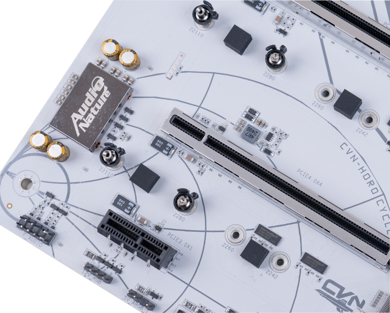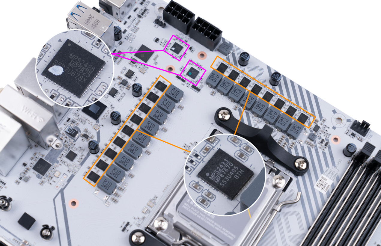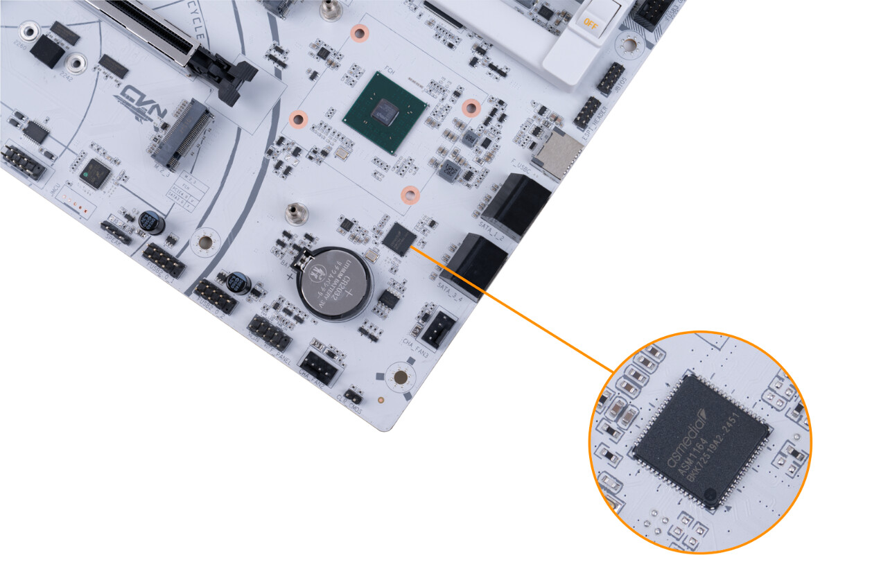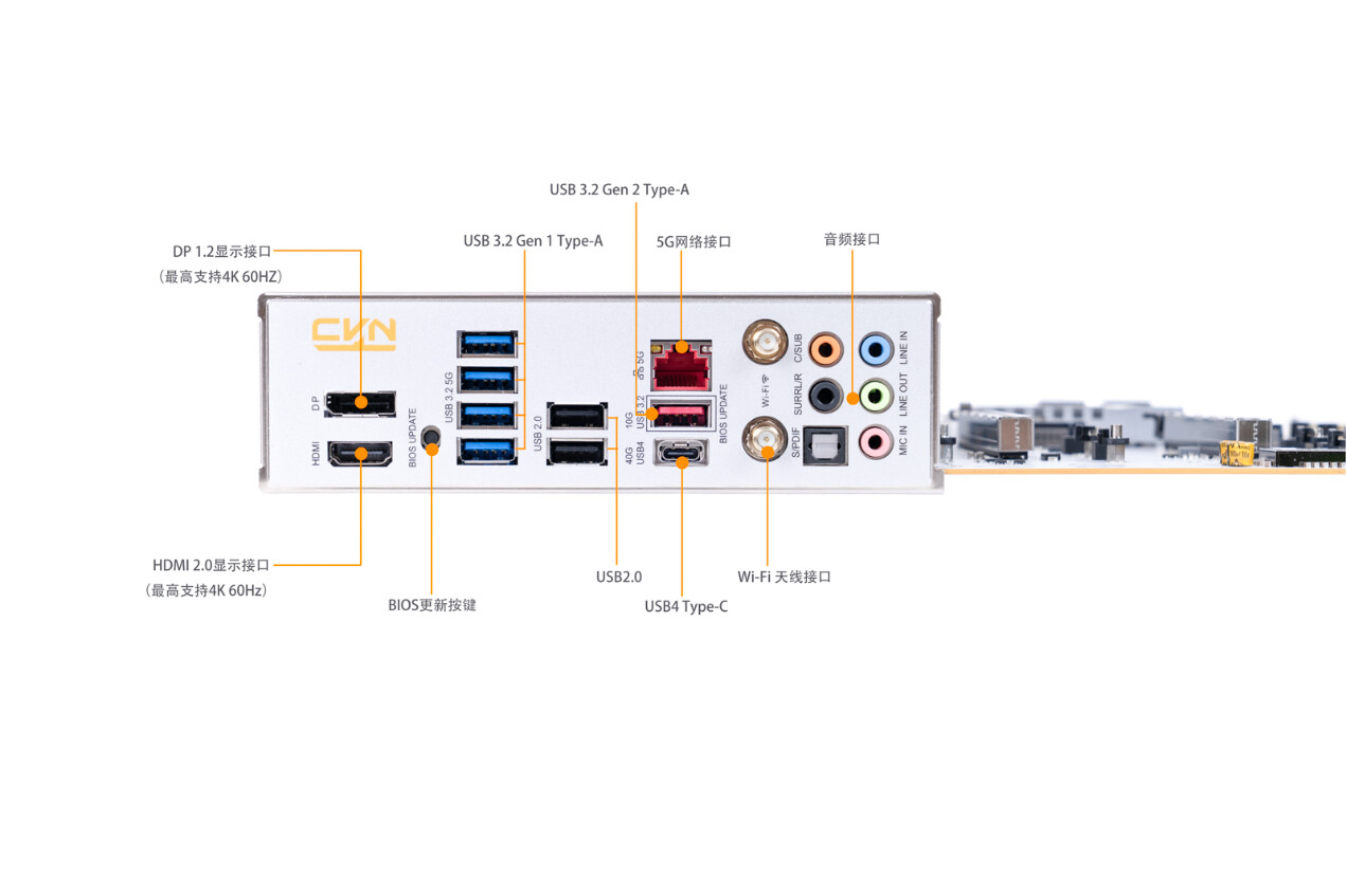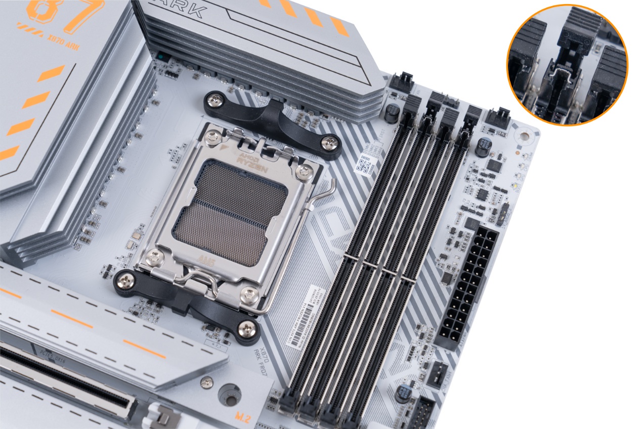 ▲包装盒采用白色和橙色的配色,展示了主板的外观和一些关键特性 ▲CVN X870 ARK FROZEN V14方舟主板尺寸为305mm x 245mm,浅灰色的PCB搭配钛灰色寒霜散热装甲,视觉上呈现出冷酷的工业美学。散热马甲内侧使用CNC工艺切割出CVN冰片复合沟槽,不仅增强了散热效率,更彰显出军工级的精致感 ▲CVN X870 ARK FROZEN V14配备AMD AM5插槽,支持 AMD Ryzen 7000/8000/9000系列处理器;在内存扩展方面,该主板配备了四条内存插槽,并采用金属加固结构,确保长期使用的稳定性。内存插槽采用单边卡口设计,单次插入即可牢固锁定内存模块,简化安装流程。CVN X870 ARK FROZEN V14支持XMP/EXPO技术,结合第二代CVN布线设计,能够轻松释放内存性能潜力,最高支持双通道8200MHz内存频率,为用户提供实用的内存扩展能力和卓越的超频表现 ▲CVN X870 ARK FROZEN V14主板为第一条PCIe 5.0 x16插槽配备了第一代CVN专利显卡快拆设计。这种设计不仅简化了显卡的安装和拆卸过程,还特别适合那些频繁更换显卡或进行硬件升级的用户。显卡快拆功能使得在拆装显卡时更加便捷,无需额外工具即可完成操作,大大提升了用户的使用体验 ▲主板背面贴有高性能的片式聚合物电容,片式聚合物电容具有极低的ESR值,能够减少电源纹波,确保CPU 例如AMD 锐龙9 9950X3D满载下稳定运行;主板右下角采用几何图案装饰,提升了整体的视觉吸引力 ▲主板IO接口一览;CVN X870 ARK FROZEN V14主板通过丰富的I/O接口设计,满足用户在显示输出、数据传输、网络连接和音频处理等多方面的需求,为用户提供了一站式的连接解决方案 ▲拆除主板正面所有散热装甲,散热装甲通过阳极氧化处理增加了金属质感。散热装甲全面覆盖主板的关键发热区域,包括芯片组、供电模块、M.2 SSD, 确保各部件在高负载运行时保持稳定性能 ▲供电部分装甲和第一条M.2 SSD散热装甲,内侧使用CNC工艺切割出复合沟槽,增加了散热表面积,不仅提升了散热性能,还增强了整机的美观度和耐用性 ▲拆除了散热装甲的CVN X870 ARK FROZEN V14方舟主板正面一览;主板采用8层服务器级PCB;两条PCIe x16插槽做了合金加固,并给第一条PCIe x16插槽加入了显卡快拆装置 ▲M.2_3 插槽与PCIe4.0 x4插槽共享带宽;当 PCIe 4.0 x4 插槽接入设备时,M.2_3 插槽将被屏蔽 ▲主板CPU供电采用双8Pin实心供电端子,能够提供稳定的电流供应,减少电压降,确保CPU在高负载运行时的稳定性;14+2+1相强化供电设计;供电PWM主控芯片采用了两颗来自MPS的MP2825;供电DrMOS芯片型号是MP87670,同样也是来自MPS,最大支持电流为80A ▲GL3523,USB 3.1集线器控制器,为后置USB3.2 gen1 5Gbps接口的HUB扩展提供支持 ▲ASM4242,USB4主控芯片,通过了USB-IF认证和雷电4认证,向下兼容雷电3、USB 3.2 Gen 2x2模式 ▲IT8856FN是一款高性能的USB Type-C Power Delivery控制器,支持高达100W的输出功率,具备快速充电、多端口支持和多种保护功能;支持多种电压输出,包括5V、9V、15V和20V ▲RTL8126,5Gbps网卡芯片,支持5G/2.5G/1000/100/10Mbps自适应速率,为主板背面的RJ45端口提供支持 ▲MT7925是联发科推出的WiFi 7解决方案,支持三频段(2.4 GHz、5 GHz和6 GHz),最高支持320 MHz頻宽,支持MLO,支持蓝牙5.4 ▲声卡采用的是Realtek ALC1220,支持7.1声道,外部用金属罩屏蔽,在屏蔽罩两侧是4颗高品质音频电容 ▲ASM1164是一款高性能的PCIe到SATA桥接芯片,支持SATA III 6Gbps数据传输速率,提供四个SATA端口,总带宽高达16Gbps ▲AMD X870芯片组配件:从安装到氛围的解决方案