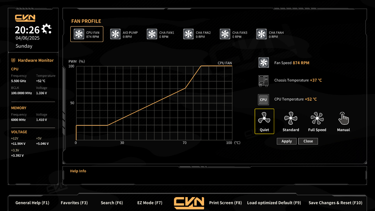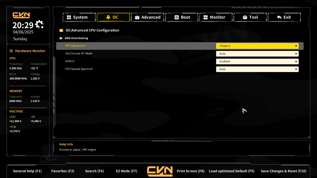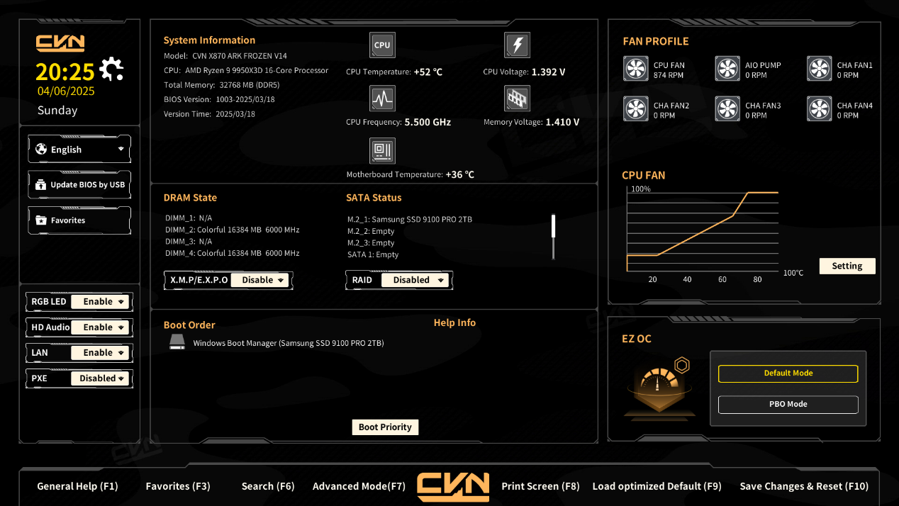 ▲开机按Del进入BIOS,首先来到的是EZ模式界面,在这里可以看到当前的硬件信息,对BIOS升级,启用XMP/EXPO功能,设置风扇曲线,以及启用AMD的PBO模式 ▲切换成简体中文后,新手小白也很容易上手 ▲风扇模式提供了Quiet、Standard、Full Speed、Manual四种模式 ▲切换成Manual模式后,StepUP/Down time归0,意味着风扇转速上升/下降时间延迟从10秒降为0秒,风扇转速会立即响应温度变化,而不会延迟,这样风扇频繁切换转速会带来显著噪音;Manual没有提供Step UP/Down time选项供用户自由设定 ▲按F7切换到高级模式;System页面显示了包含硬件监控、处理器信息、内存信息和电压信息等内容 ▲OC页面,在这里可以对CPU和内存超频;X3D Game Mode是专为AMD X3D CPU系列设计的游戏优化模式,可能通过调整缓存分配或核心调度提升游戏性能。禁用时保持默认的多任务性能- PPC Adjustment:调节AMD处理器的功耗策略(如限制峰值功耗以降低温度)。PState 0为最高性能模式,其他PState为节能模式