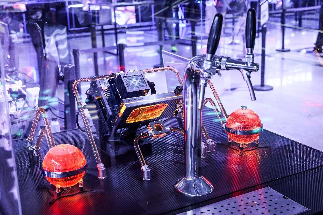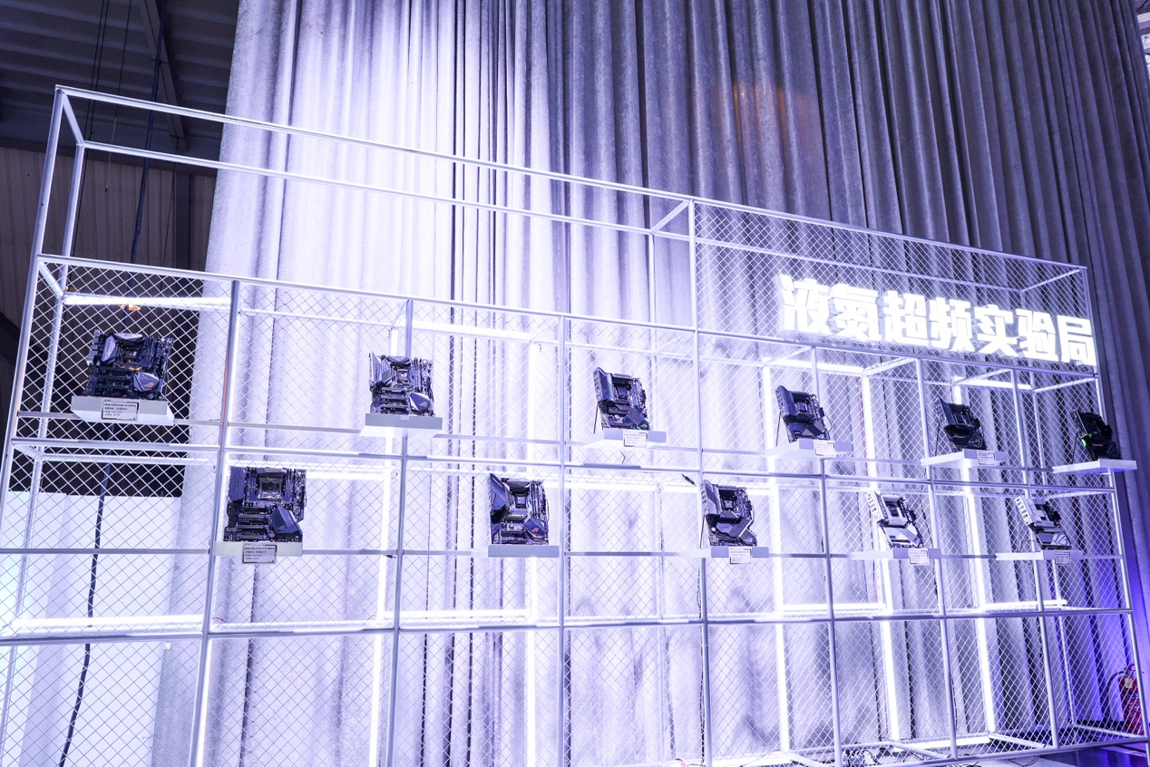 在此区域,特别展出了历代ROG APEX系列主板,自2017年首款ROG MAXIMUS IX APEX主板至今,共计11款的APEX系列主板。凭借过硬的实力,ROG APEX系列主板不断缔造新的超频纪录,是硬核发烧友的神兵利器。一旁还有ROG美汁汁液冷机带来的酷爽体验,显然是倾倒液氮刺激之余的最佳补剂!