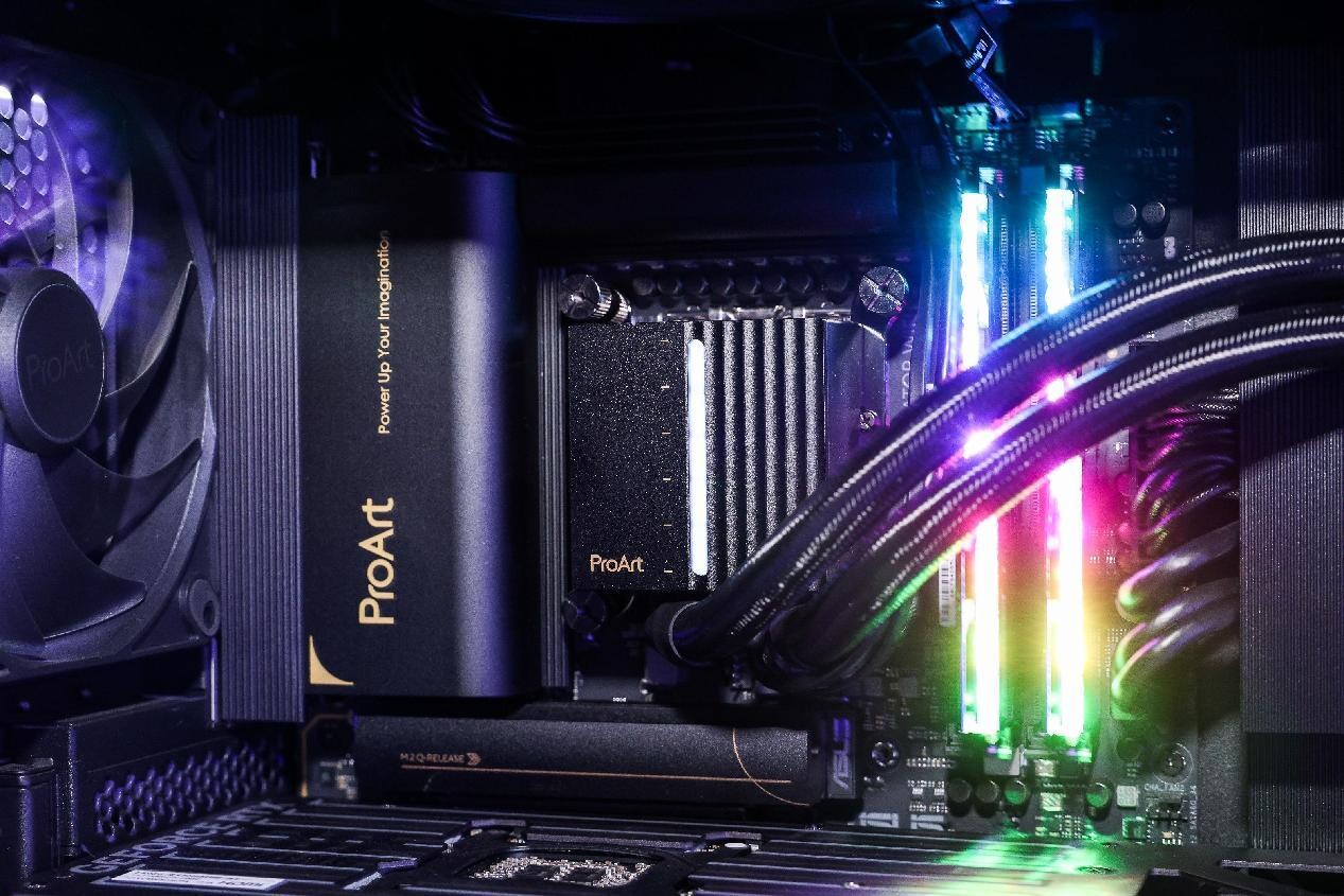 其中一台AI PC基于ProArt Z890-CREATOR WIFI创艺主板打造,旗舰级配置赋能数字艺术创作。主板延续了ProArt独有的设计风格,以黑色为主调,并采用多层纹理与金色线条交织设计,整体低调且奢华。采用16(90A)+1(90A)+2(90A)+2(80A)供电模组,加上近乎全覆盖的散热装甲,足以应对3D动画、视频渲染和软件编译等高负载多线程任务。板载5个PCIe M.2接口、2个雷电5接口和1个雷电4接口,满足高速数据传输需求,便于创意工作者同时外接多种设备。配备万兆+2.5G双有线网卡,还支持WiFi 7,可实现更快的大型文件、高分辨率视频流和资源共享传输。还有华硕远程管理中心软件(ASUS Control Center Express)和Creation First创艺专注模式,软硬结合,助你畅享自由,放肆才情!另支持AI智能超频、AI智能散热2.0及AI智能网络2.0,全方位提升性能。ProArt创艺控制中心可轻松统一管理所接入的ProArt系列产品,强化工作效率。