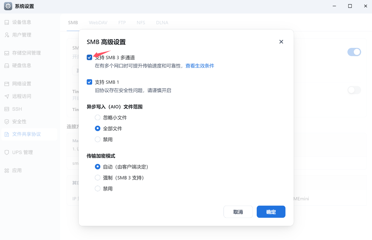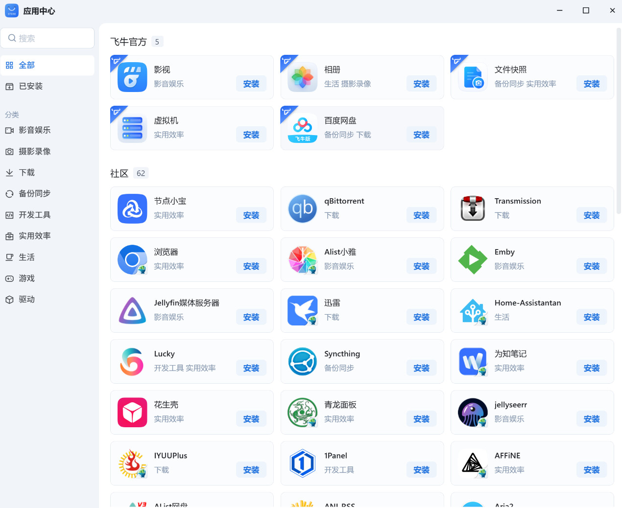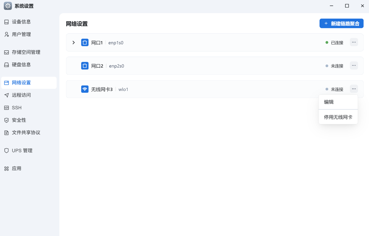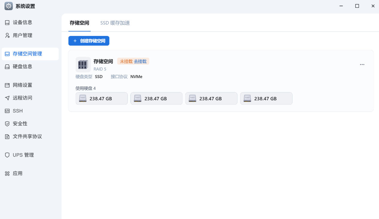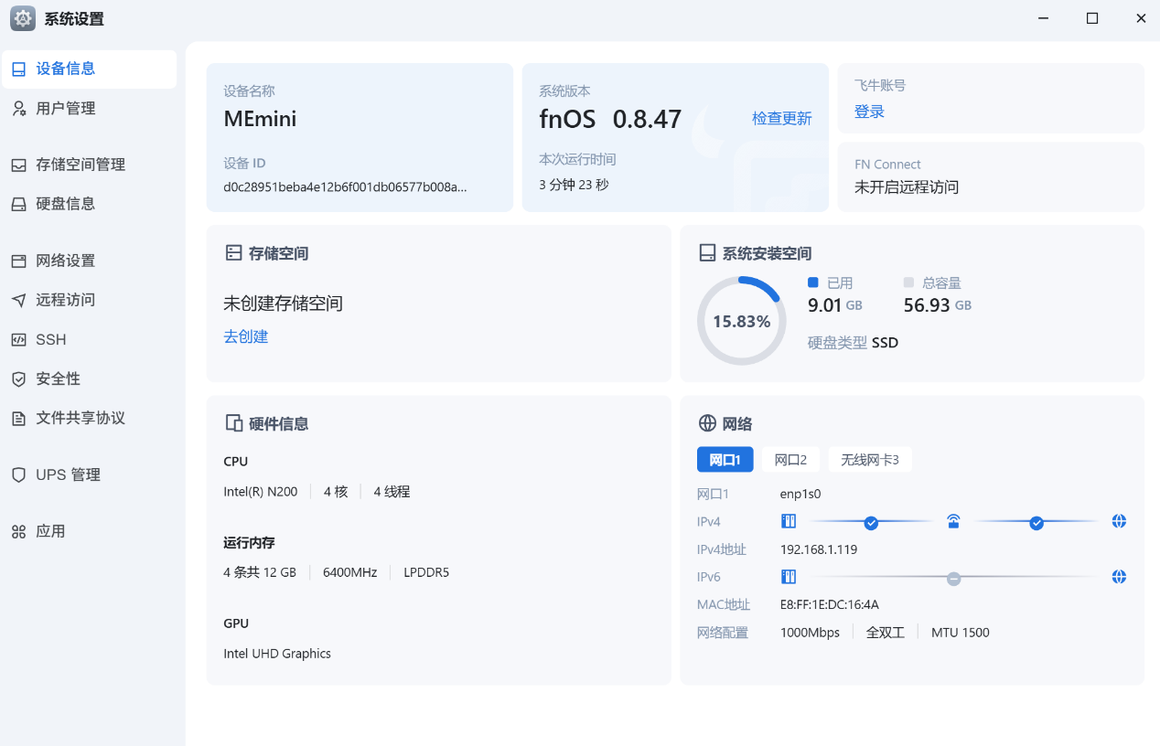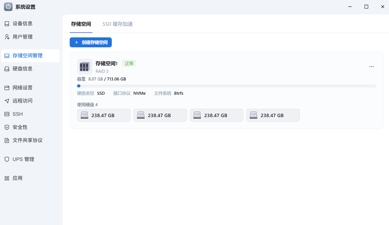 ▲在浏览器中输入fnOS的IP,用户即可快速进入网页配置界面,轻松创建超级管理员账号,开启专属存储空间管理之旅。简洁直观的操作流程,即使是初学者也能迅速上手。 ▲进入主页面后,第一步便需创建储存空间,系统提供RAID 0、 RAID 1、RAID 5等多种模式供用户选择。若用户之前在其他设备上装过fnOS,只需将所有硬盘移过来,简单挂载操作即可完成存储空间创建,轻松迁移数据,省时省力。 ▲在存储空间管理区域,用户可清晰查看已创建的存储空间详情。当前显示的存储空间1采用RAID 5模式,使用4块256GB的SSD硬盘构建而成。 ▲在系统设置中,用户可清晰查看当前的设备名称、系统版本、储存空间容量以及CPU信息等关键数据,方便用户实时掌握设备运行状态,为精准的设备管理依据,确保设备始终处于最佳运行状态。 ▲fnOS驱动基本完善,零刻ME mini上的WiFi网卡能够被完美识别,实现流畅稳定的无线网络连接。 ▲系统支持SMB3多通道,当使用多个网口时,可显著提升传输速度和可靠性,满足用户在高速网络环境下对海量数据传输的需求。 ▲fnOS应用中心为用户提供了丰富多样的应用程序选择,用户可根据自身需求安装各类应用,进一步拓展设备功能。无论是办公协作工具、多媒体管理软件,还是数据备份与恢复解决方案,都能在应用中心轻松找到并一键安装。应用场景:广泛适用