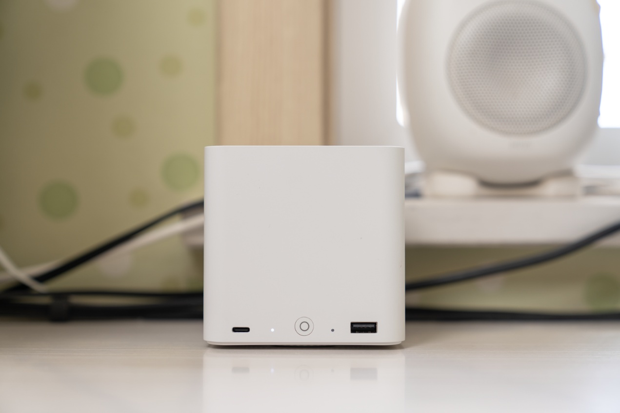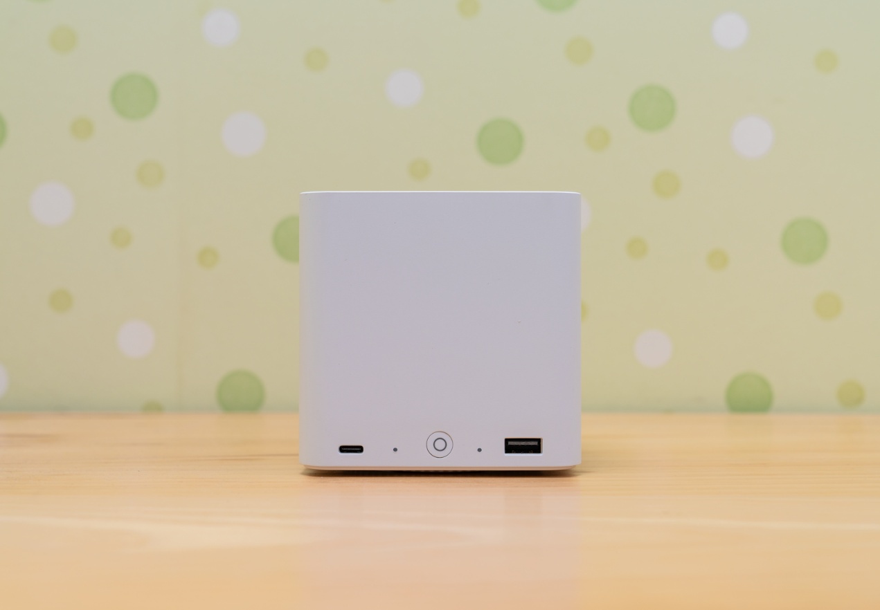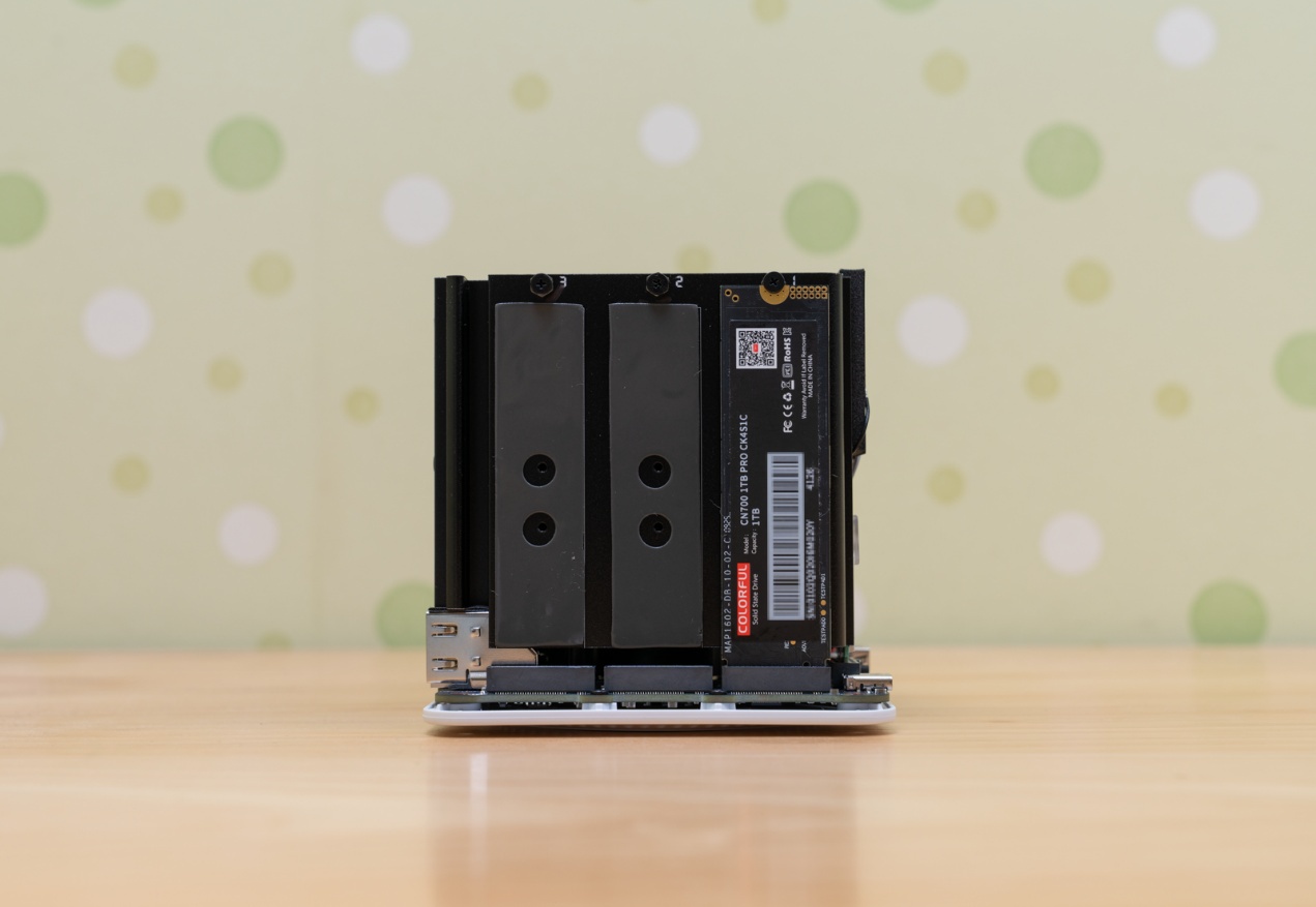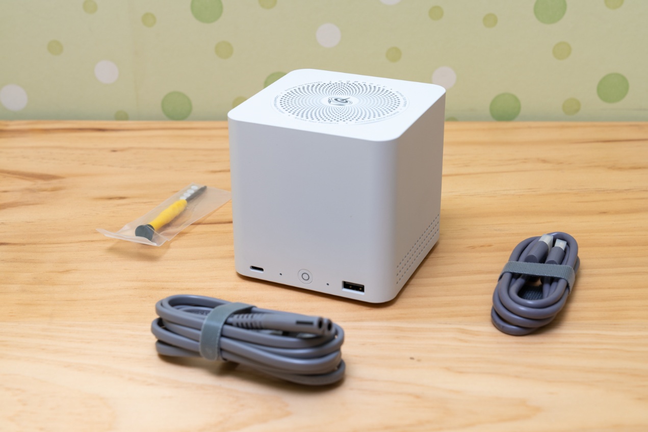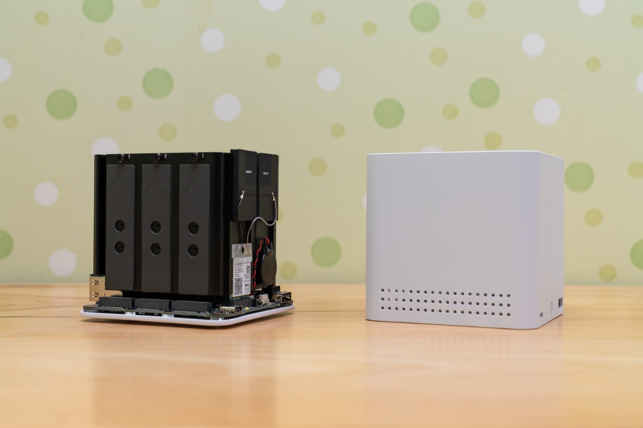 ▲零刻 ME mini 6 盘位固态 NAS 迷你主机采用白色包装盒,正面应有“ME mini”字样,整体风格简洁明了。 ▲零刻ME mini 6 盘位固态 NAS 迷你主机的包装盒内配件一目了然,随机附带了一根 HDMI 线、一根电源线、一把螺丝刀以及四颗橡胶垫片,为用户的安装与使用提供了全面的基础保障,从开箱的那一刻起便让用户感受到贴心与便捷。 ▲零刻ME mini 6 盘位固态 NAS 迷你主机正面一览;左侧是一个USB Type-C(10Gbps)接口,中间是圆形电源按键,右侧是一个USB3.2 Gen2 Type-A(10Gbps)接口 ▲背面IO接口一览;通过背部的二维码可以下载beelink St软件,连接ME设备,实现便捷的设备管理和远程控制。 ▲底部配备 CLR CMOS 按钮,方便用户在需要时快速清除 CMOS,恢复系统默认设置。四周的圆形孔洞设计用于冷空气的进入,与顶部的通风孔协同工作,形成良好的空气对流,有效提升散热效率,确保设备在长时间运行过程中保持稳定,延长硬件使用寿命。内部设计:布局合理,散热高效