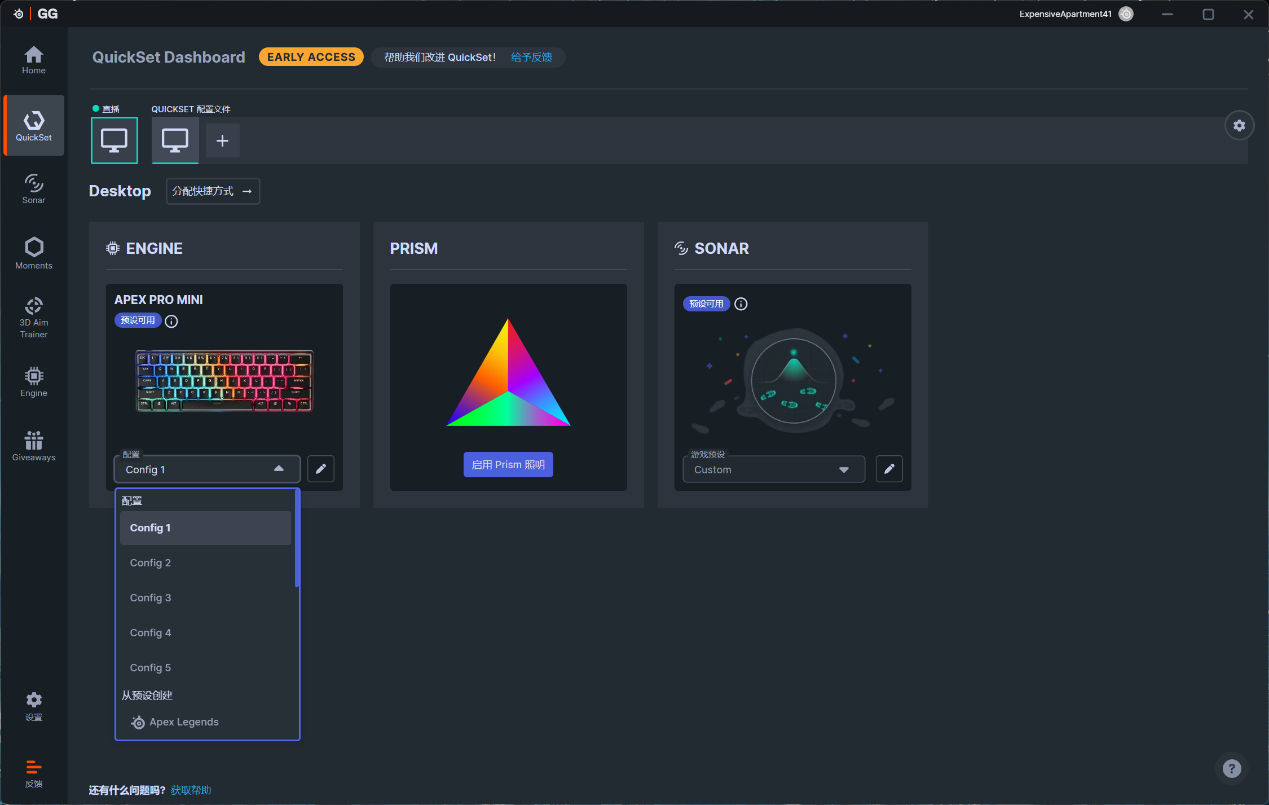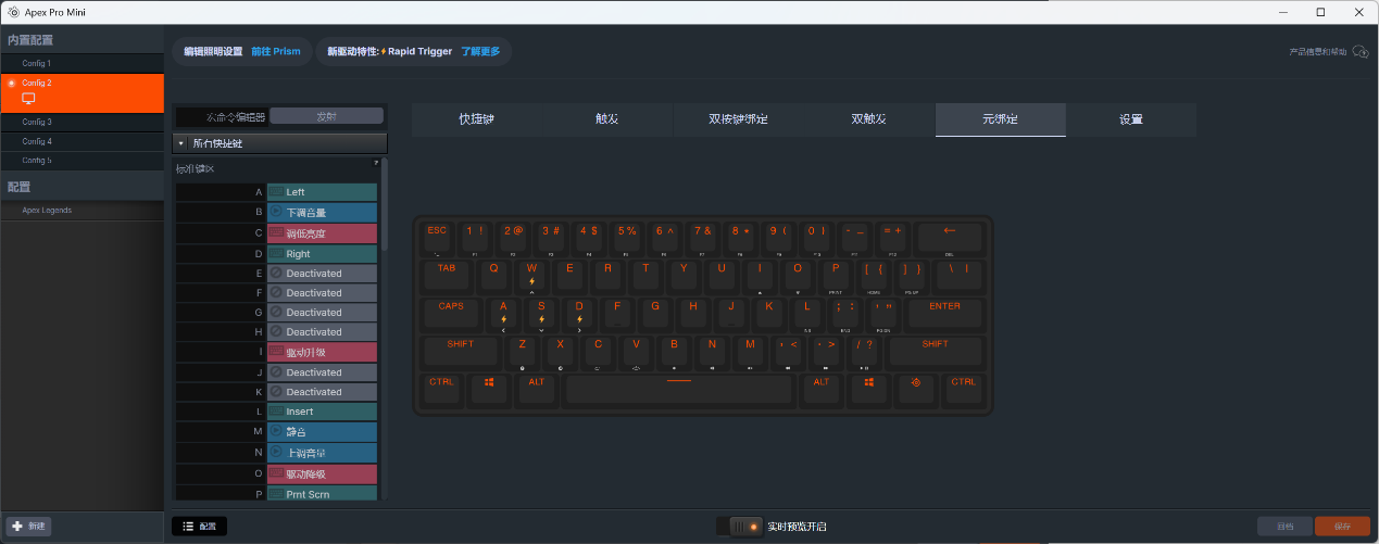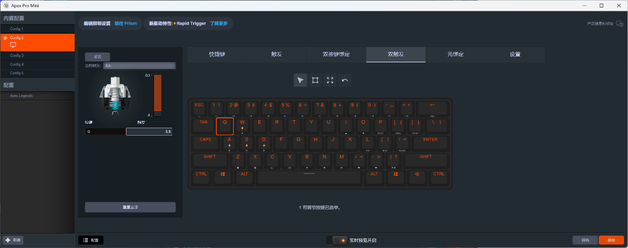▲SteelSeries GG整个界面采用深色主题,布局清晰,功能模块分明,方便用户对游戏设备(键盘、鼠标、耳机)的灯光、音频等进行快速设置和管理。- ENGINE :设备引擎设置区域,展示当前连接的“APEX PRO MINI”键盘,有多种配置选项,可从多个自定义配置(Config 1 至 Config 5)、从预设创建(游戏预设)中进行选择。预设可以自定义快速触发、保护模式、快速点击和关键控制键的触发级别,