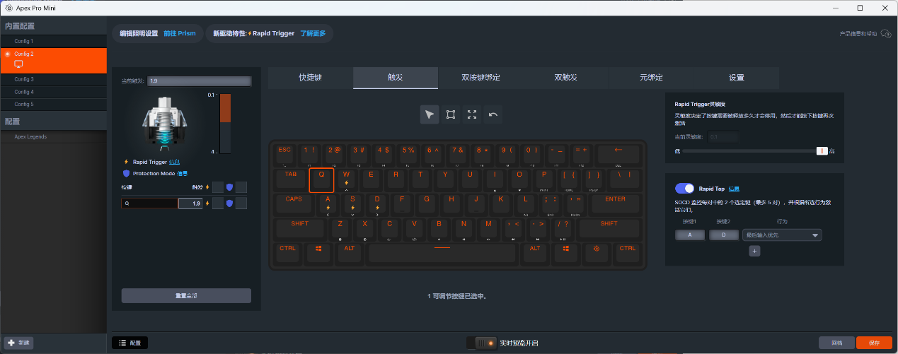 - Rapid Tap为用户提供看灵活的按键优先级设置选项;例如最后键入优先允许用户在按下两个指定按键时,系统会优先处理最后一个按键的输入并自动释放之前的按键。这种功能在需要快速响应的场景中非常有用,比如在FPS游戏中,玩家可以快速切换方向或执行其他操作,而无需手动释放之前的按键。