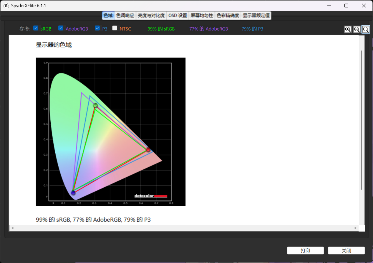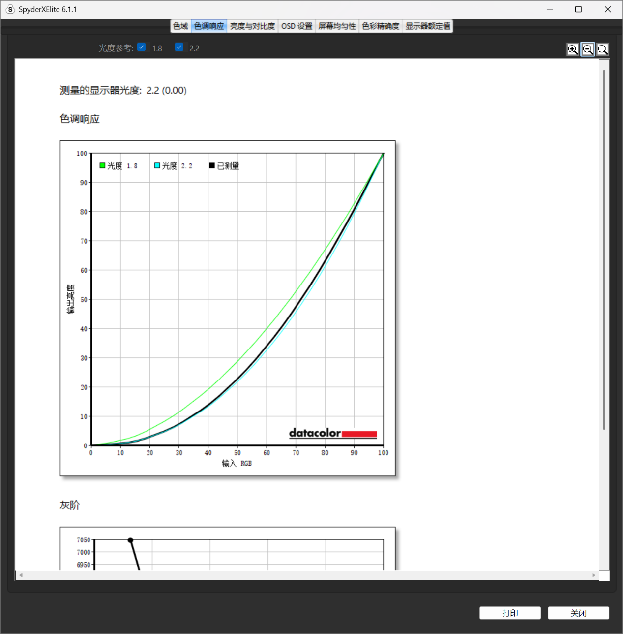 ▲测得七彩虹隐星P16 Pro屏幕的色域为99%的sRGB,77%的AdobeRGB,79%的P3。从整体色域表现来看,七彩虹隐星 P16 Pro 的屏幕具备较为均衡的色彩表现能力。虽然在专业图像处理和影视后期制作的高端领域,其色域覆盖程度尚有提升空间,但对于大多数日常使用场景以及部分专业性稍弱的创意工作需求而言,已经足够优秀。特别是对于一台定位于游戏本的产品而言,这样的色域表现已经能够满足游戏画面的色彩需求,为用户带来更加沉浸的游戏体验。 ▲色调响应方面,测得的黑色曲线和光度2.2理论值蓝色的曲线保持一致时成绩最为优秀。从测得的成绩看,测得的黑色曲线和蓝色曲线完全一致,没有偏差。这种精准的色调响应表现意味着屏幕能够准确地还原不同亮度下的色彩细节,无论是明亮的画面还是黑暗的场景,都能呈现出自然且真实的视觉效果。- D65,即6500K色温时的色彩是最准确的。在所有亮度下,屏幕的右上区域(第三象限)色彩最为准确,ΔE值为 0.0。