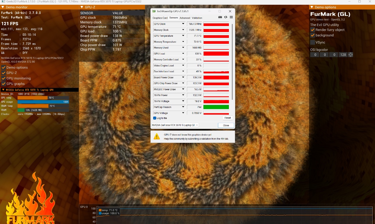 ▲FurMark拷机10分钟,观测RTX5070Ti Laptop GPU功耗、温度、显存温度等信息 ▲显卡功耗在整个测试过程中相对稳定,基本维持在135W到145W之间,平均功耗在140W左右。这种稳定的功耗表现使得RTX5070Ti Laptop GPU在运行过程中能够持续提供较高的性能输出。 RTX 5070 Ti Laptop GPU设计功耗为140W,从图表可见其功耗稳定在140W左右,符合满功耗版标准,无论运行大型游戏还是进行图形渲染等专业工作,都能保持高帧率和高效能处理,提升工作效率和游戏流畅度。 ▲GPU的时钟频率在整个测试过程中保持了较高的稳定性,维持在1.94GHz左右;而显存时钟频率在初始阶段经历了几次调整后也趋于稳定,稳定在1.37GHz ▲GPU和显存的温度在测试过程中都表现出较好的稳定性,维持在71℃附近,没有出现异常的温度波动或过热现象。这种温度控制有助于确保RTX5070Ti Laptop在长时间高负载运行下的可靠性和性能。双烤CPU+GPU:资源分配的智慧