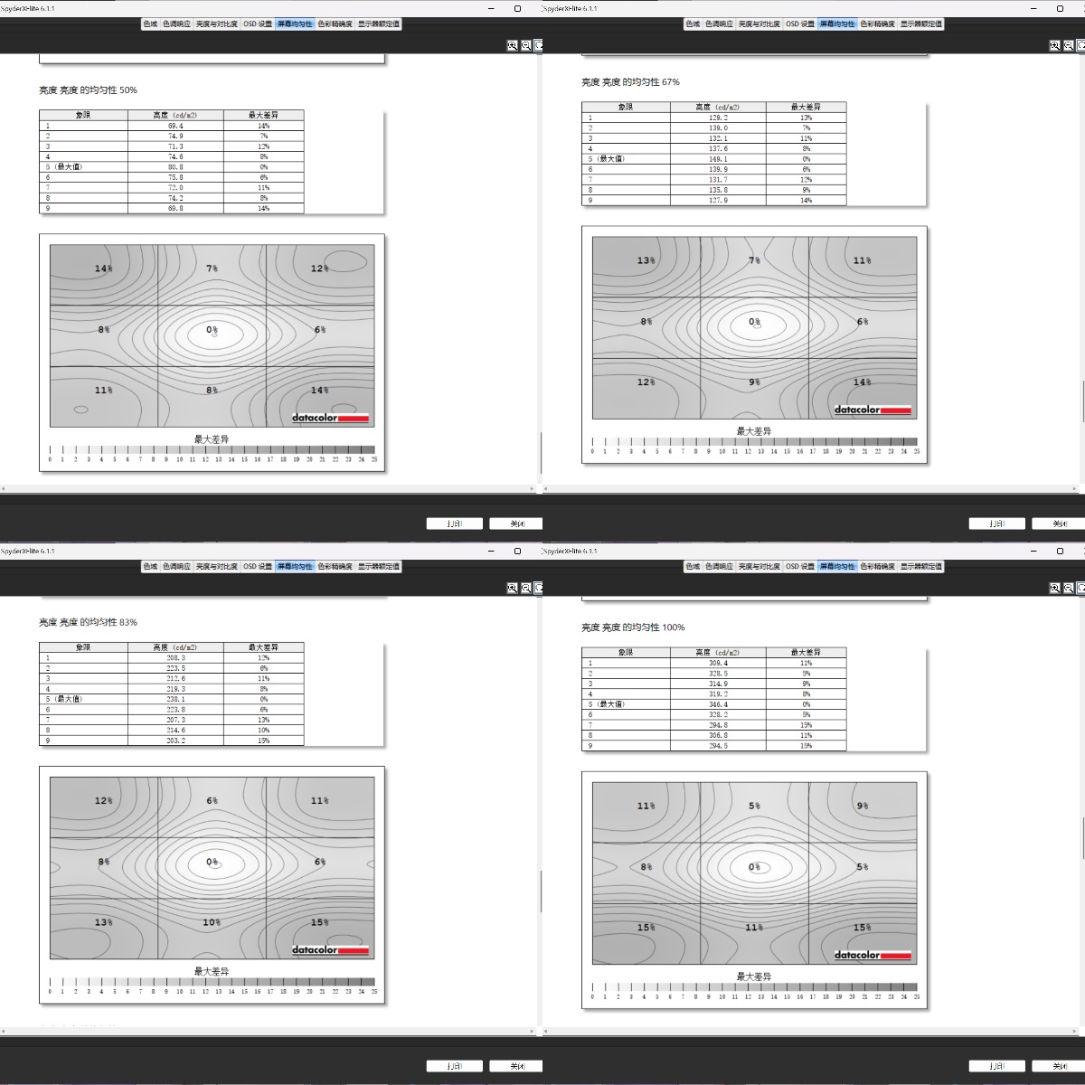 - 在所有测试的亮度级别中,屏幕的中心区域(第五象限)亮度均匀性表现优秀,亮度差异均为 0%。