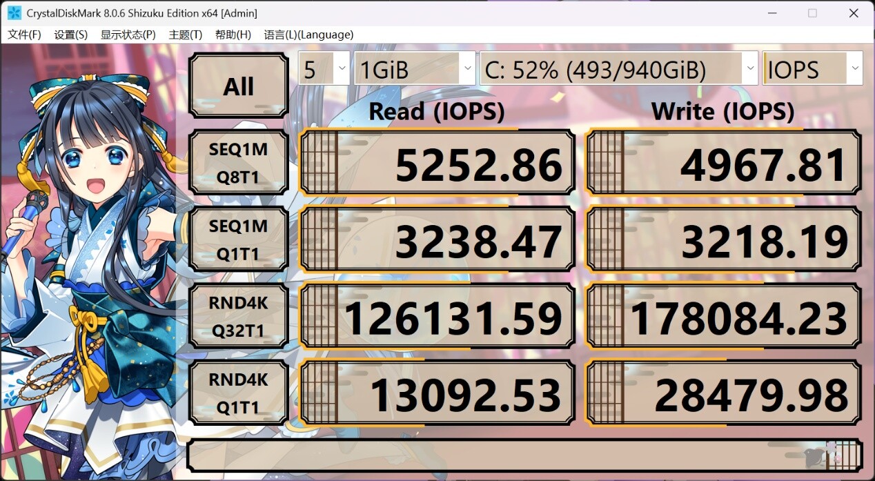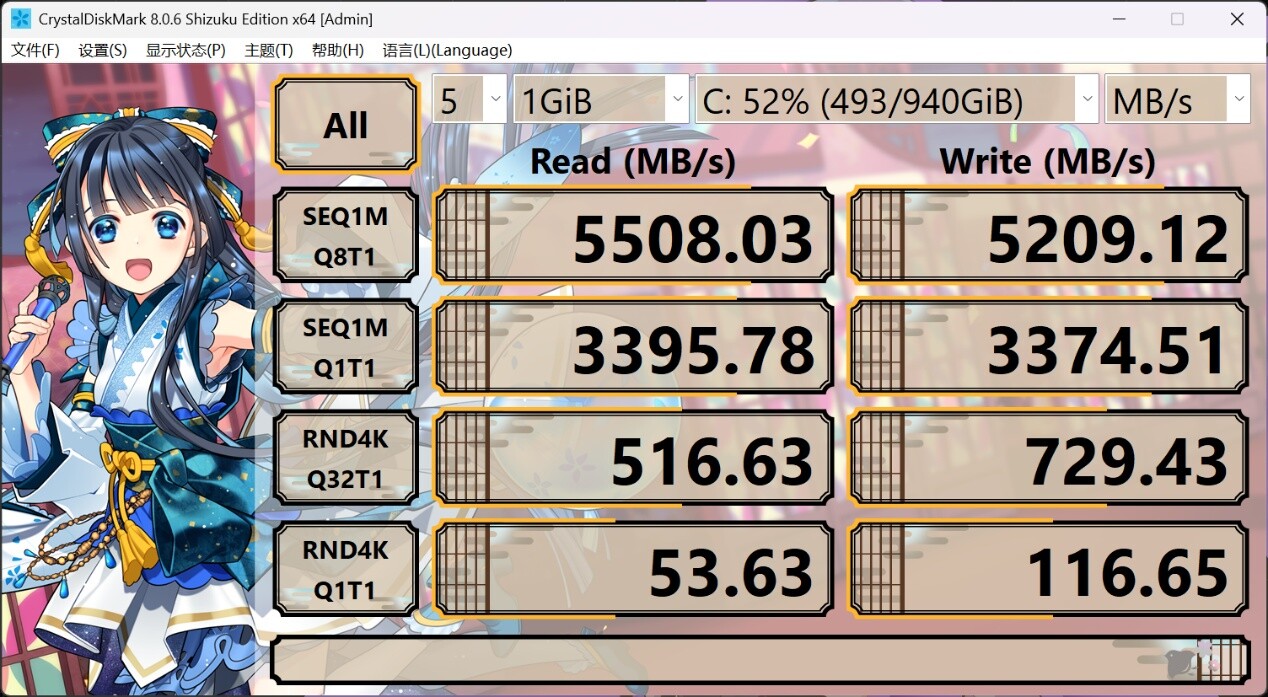 ▲七彩虹隐星P16 Pro搭载的M.2 SSD采用PCIe4.0 x4接口;型号为YMTC PC41Q-1TB-B : 1024.2 GB ▲顺序读写速度均超过50,000 MB/s,随机读写速度也处于较高水平;高IOPS值确保了系统在处理大量小文件读写请求时的快速响应;对于游戏玩家和内容创作者来说,这款固态硬盘能够显著减少游戏加载时间和文件保存时间,提升工作效率。CPU性能