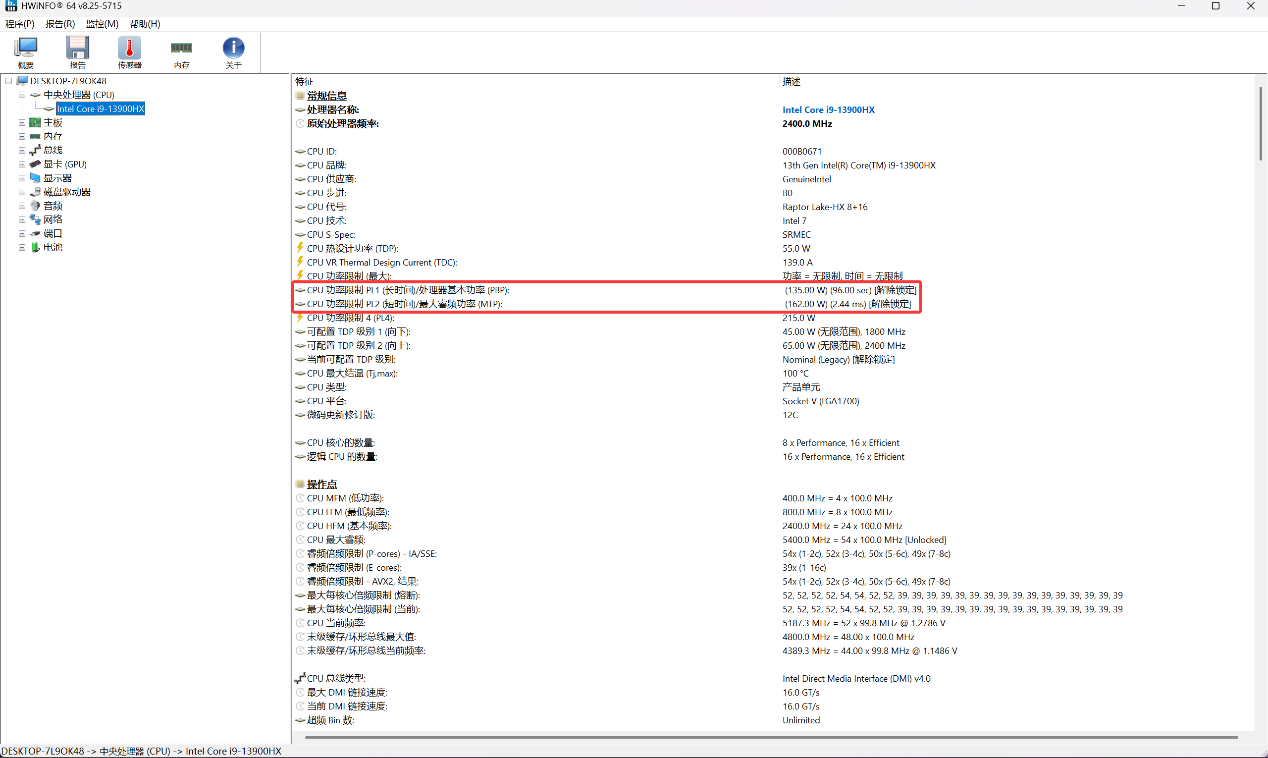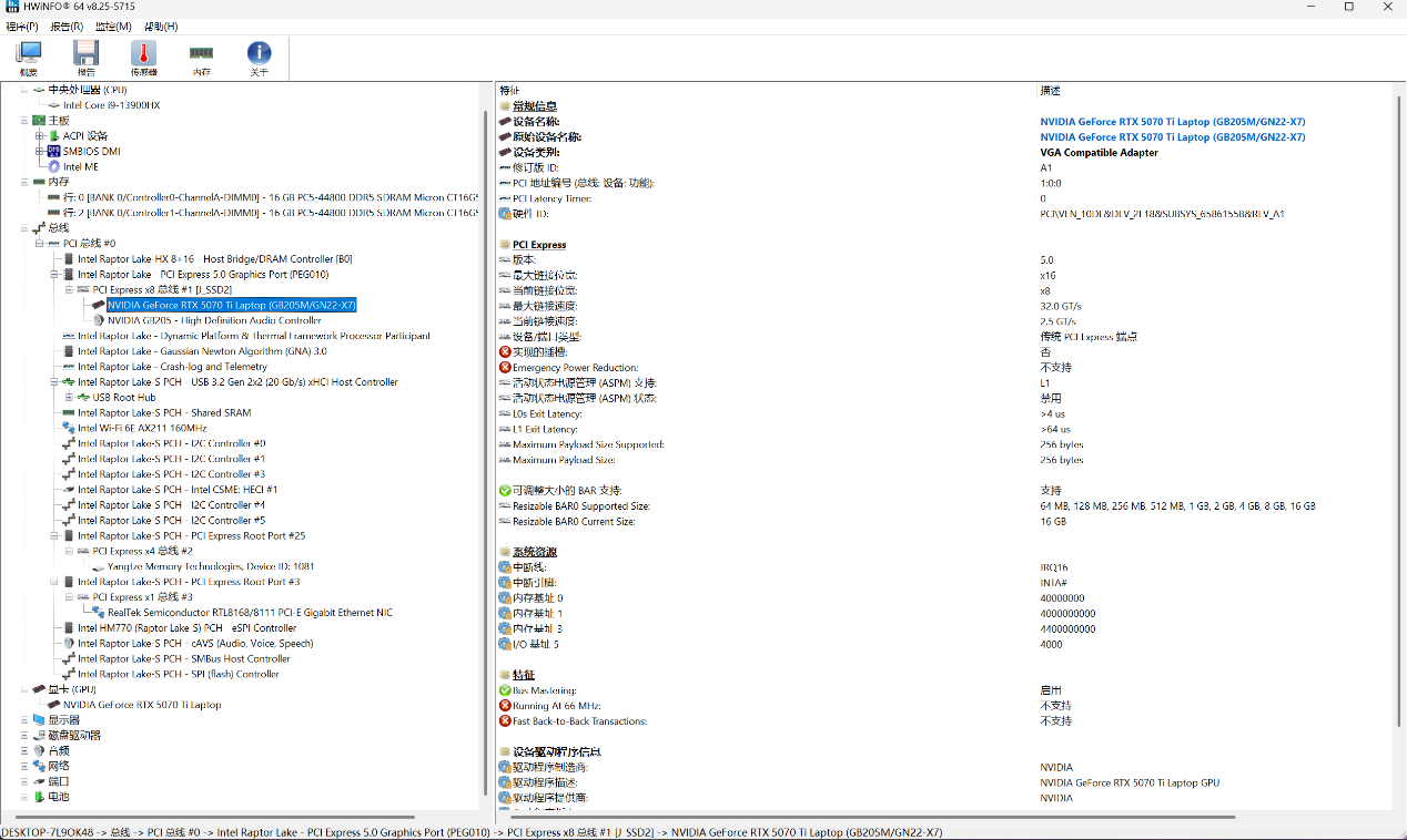 ▲七彩虹隐星P16 Pro搭载了Intel Core i9 13900HX CPU和满功耗140W NVIDIA Geforce RTX 5070Ti Laptop GPU ,配备32G DDR5 5600MHz内存,预装Windows 11家庭中文版。 ▲设备管理器信息。 ▲CPU-Z信息;Intel Core i9 13900HX具备24核心32线程,内存为2 x 16GB DDR5 5600MHz;独显型号为NVIDIA Geforce RTX 5070Ti Laptop GPU。 ▲CPU ID。 ▲GPU-Z信息,由于最新版本的GPU-Z还无法完全识别RTX5070 Ti Laptop GPU,所以会有部分信息显示为Unknow。 ▲HWiNFO CPU和GPU信息 ▲CPU的TDP为55W,PL1为135W,PL2为162W。 ▲PCIe通道分布信息。星知岛:好用,好玩,安全可靠的私人智能助手