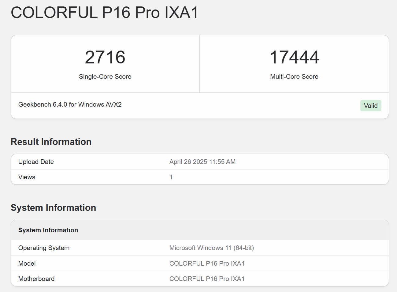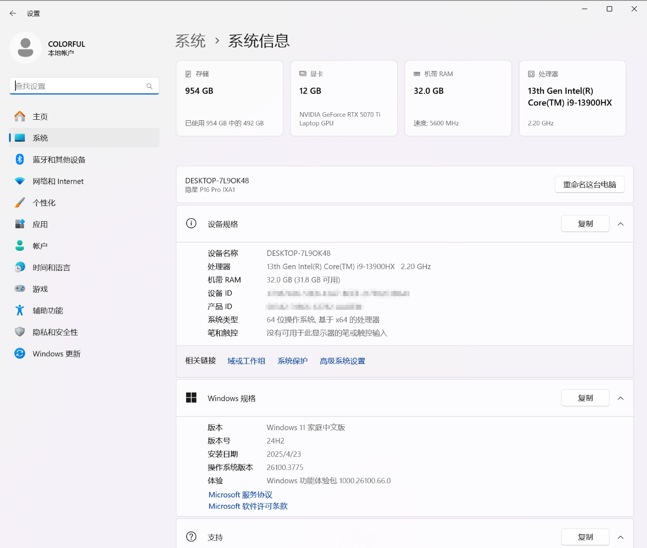 ▲外包装采用紫色配色,封面印有七彩虹隐星系列专属的二次元IP形象 “隐姬”,她以凌空跃动的活泼姿态亮相,为产品增添了一份独特的文化魅力,瞬间抓住年轻玩家的心。 ▲附件包含一根电源线,一个电源适配器,说明书及若干导热垫。 ▲电源适配器输出功率为230W,确保七彩虹隐星P16 Pro游戏本在高负载运行时能够获得充足的电力供应。 ▲七彩虹隐星 P16 Pro 游戏本采用雾屿白配色,A 面为简洁纯白设计,中间是条形渐变设计,底部印有七彩虹的 Logo。搭配哑光喷砂工艺,触感舒适且不易留下指纹和划痕,尽显精致质感。 ▲七彩虹隐星P16 Pro的D面(底面)为黑色,大面积的散热孔均匀分布,以增强空气流通,提升散热效果。在D面的底部有四个防滑脚垫,能有效防止使用过程中设备滑动,同时略微抬起机身,进一步优化散热空间。贴纸上印有产品的详细信息,包括规格、认证标识以及序列号等。 ▲七彩虹隐星P16 Pro的B面(屏幕面)配备了一块16英寸的IPS超高清屏幕,屏幕上方居中位置配备了一颗摄像头,集成了麦克风阵列,满足用户日常视频通话和直播的需求。屏幕采用了三面窄边框设计,提供了更加沉浸的视觉体验。 ▲屏幕支持 2.5K 分辨率和 240Hz 高刷新率,同时覆盖 100% sRGB 色域,能够呈现出清晰、流畅且色彩鲜艳的画面,非常适合游戏和创作场景。键盘带RGB背光,不仅在黑暗环境下方便使用,还增添了科技感。 ▲C 面(键盘面)采用全尺寸键盘,带有独立的数字小键盘,对于需要频繁输入数字的场景,可以大大提高输入效率。键盘的键程适中,回弹有力,适合长时间输入。触控板位于键盘下方,尺寸适中,支持多点触控,操作灵敏。 ▲七彩虹隐星P16 Pro左侧配备了一个 USB3.2 Gen1 Type-A 接口和一个 2合一音频插孔。USB3.2 Gen1 Type-A 接口支持高速数据传输,可方便地连接外部存储设备、移动硬盘、U 盘等,传输速度更快,效率更高。2合一音频插孔则可以同时连接耳机和麦克风,满足用户在游戏、视频通话、录音等场景下的音频输入输出需求,提供清晰的音质和良好的通话体验。 ▲七彩虹隐星P16 Pro右侧配备了一个 USB 3.2 Gen 2 Type-A 接口和一个支持 PD协议的 USB 3.2 Gen 2 Type-C 接口。不仅可以快速连接外部存储设备、移动硬盘、键盘、鼠标等,满足日常使用需求,还能方便使用支持PD协议的充电头为笔记本充电。 ▲七彩虹隐星P16 Pro背面接口布局丰富,可以满足多种连接需求。HDMI 输出端口,可用于连接电视或投影仪扩展显示;DisplayPort 1.4 over USB 3.2 Gen 2 Type-C 接口,支持高分辨率视频输出与高速数据传输;RJ45 网口,保证有线网络连接稳定低延迟;DC-in 电源接口,用于连接电源适配器为笔记本供电。这些接口为用户带来便捷的设备连接与扩展体验。系统信息:核心配置与性能基石