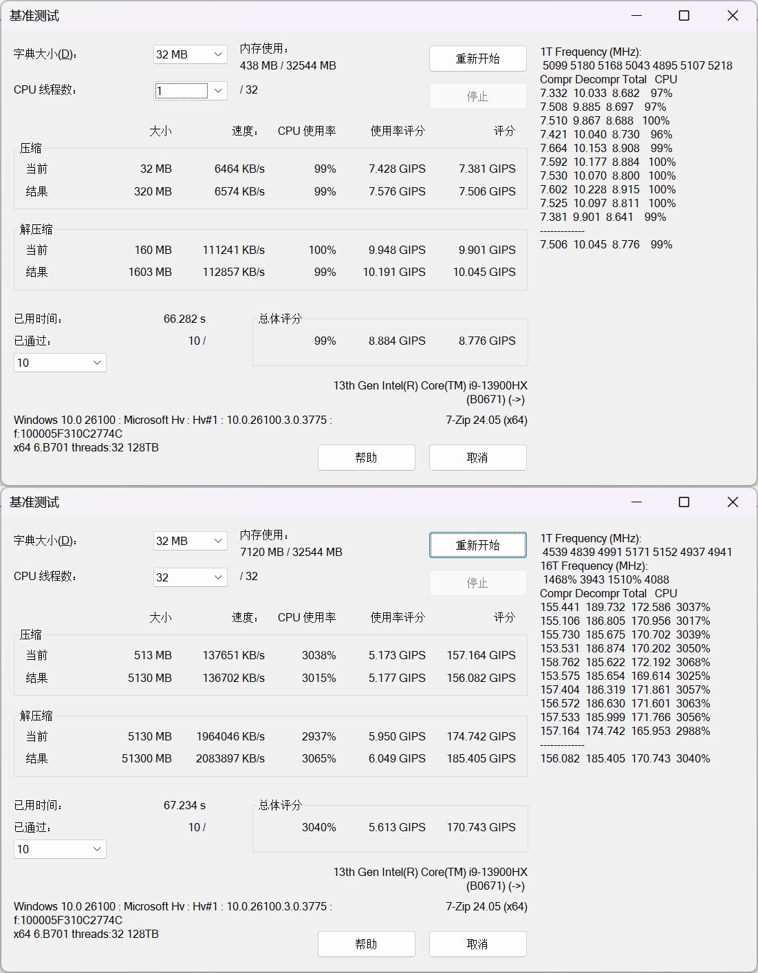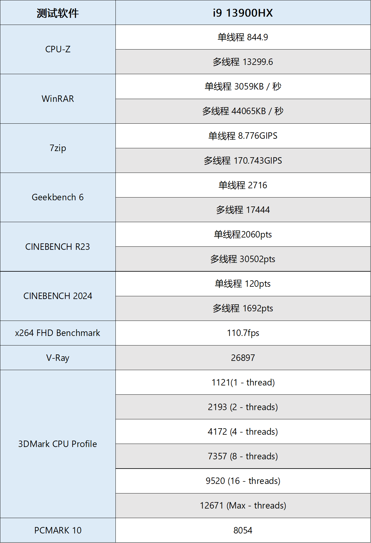 ▲CPU-Z测试分数;单线程844.9,多线程13299.6 ▲WINRAR 7.11单线程和多线程测试 ▲7-Zip 24.05单线程和多线程测试 ▲Geekbench 6测试,单核心分数为2716,多核心分数为17444 ▲CINEBENCH R23测试,单核心分数为2060pts,多核心分数为30502pts ▲CINEBENCH 2024测试,单核心分数为120pts,多核心分数为1692pts ▲V-Ray Benchmark得分26897 ▲x264 FHD Benchmark,x264视频编码测试程序。Intel Core i9 13900HX每秒可渲染110.7帧 ▲3DMark CPU Profile测试,可以测试CPU在不同线程下的性能表现 ▲PCMARK 10分数8054;常用基本功能得分10471,生产力得分8136,数位内容创作得分16644 ▲i9-13900HX在移动端CPU中属于旗舰级水平,不但能在常见单线程应用场景如简单编码、日常办公软件等运行流畅,还能在多任务并行处理、大型渲染、视频编码等多线程密集型工作负载下,具备强大处理能力,大幅缩短任务处理时间。无论是用于内容创作、游戏还是日常办公,都能提供出色的性能体验,适合对性能要求较高的用户。GPU性能