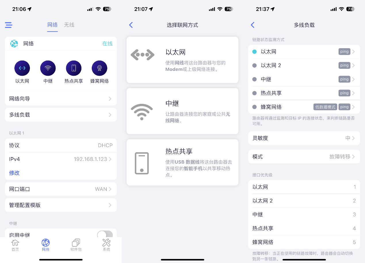 ▲路由器支持多种联网方式,包含以太网、中继、热点共享等;多线负载支持故障转移或负载均衡。