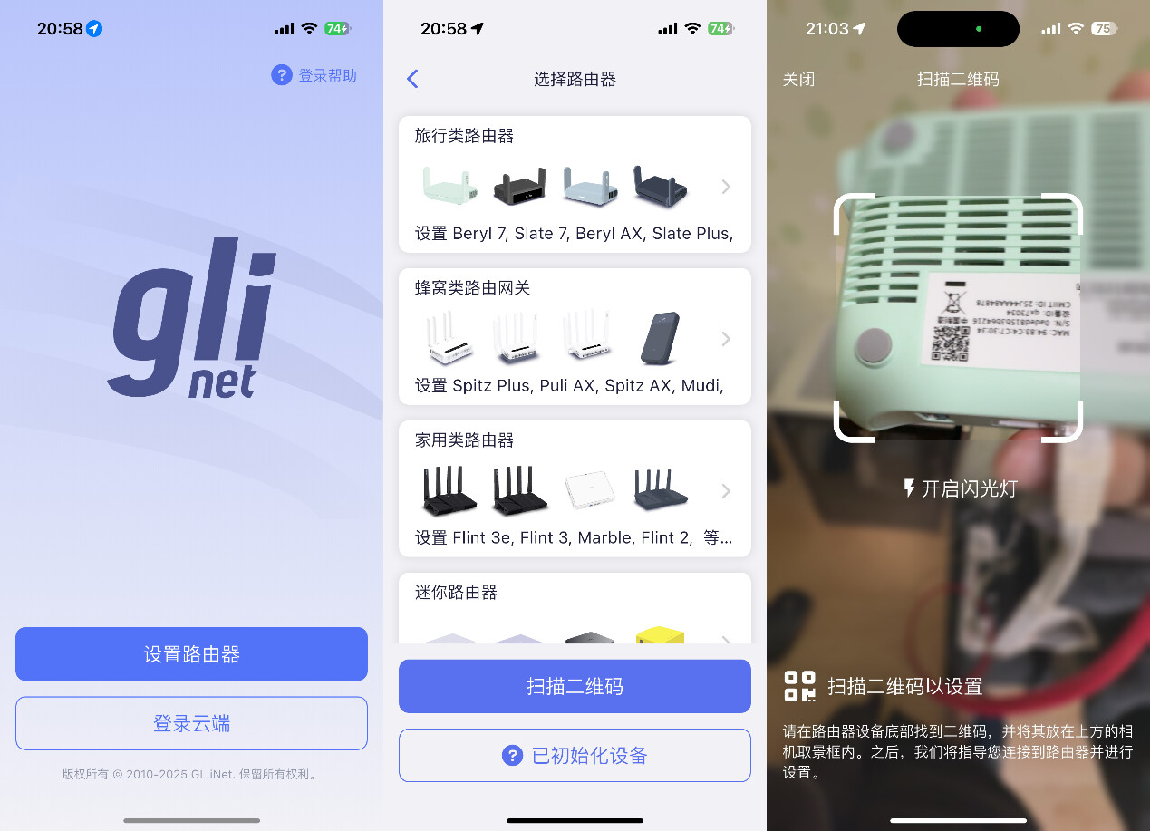 ▲使用Glinet APP可以对Beryl 7 GL-MT3600BE进行管控,首先进入APP,手动选择对应的路由器,或者直接扫描路由器上的二维码进行连接。