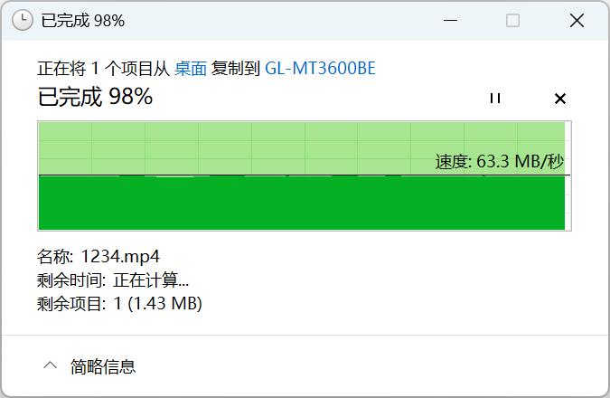 ▲使用ASUS PCE-BE90BT无线网卡,5G无线写入速度63.3MB/S。