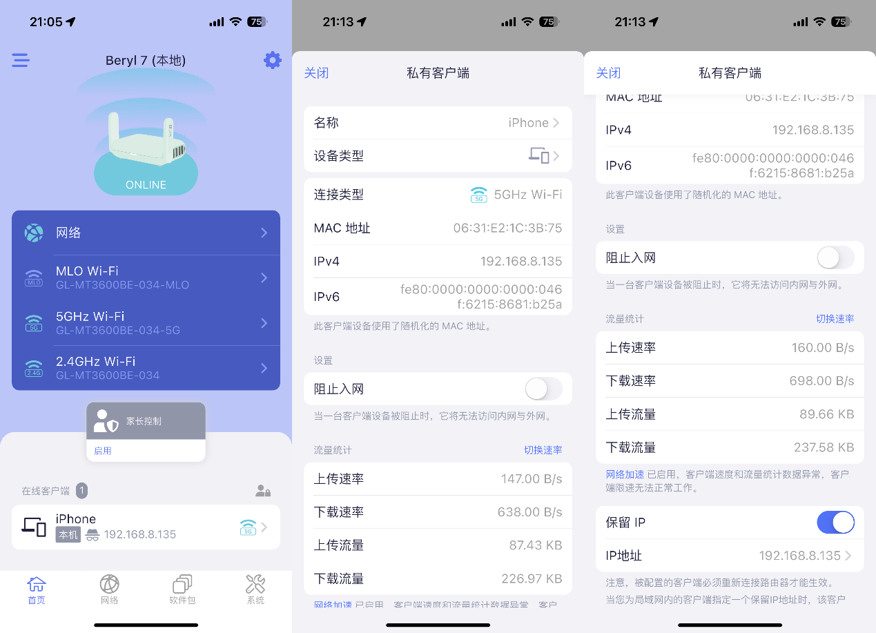▲来到APP主页面,这里可以显示当前的WiFi网络,包括2.4G、5G、MLO网络,还能显示当前在线和离线客户端,查看客户端的详细信息,并给客户端设置静态IP(保留IP)。