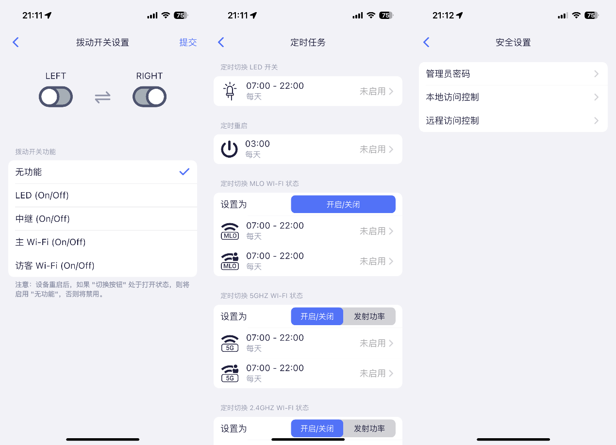 ▲支持对Toggle拨钮进行功能自定义,可按需设置为开关主Wi-Fi、访客 Wi-Fi、LED 灯或中继模式,让物理按键的用途更贴合个人使用习惯;同时,系统还配备了定时任务功能,能设置每日固定时段切换 LED 开关、重启设备,或是开启/关闭不同频段的Wi-Fi,方便用户按需规划设备运行状态;安全设置板块则提供了管理员密码、本地/远程访问控制等选项,兼顾了功能灵活性与网络安全性。