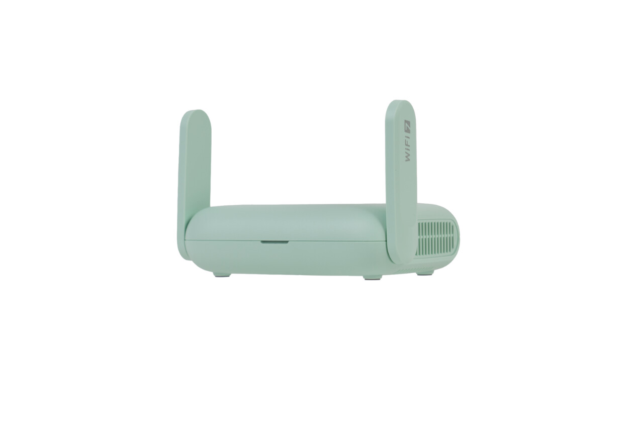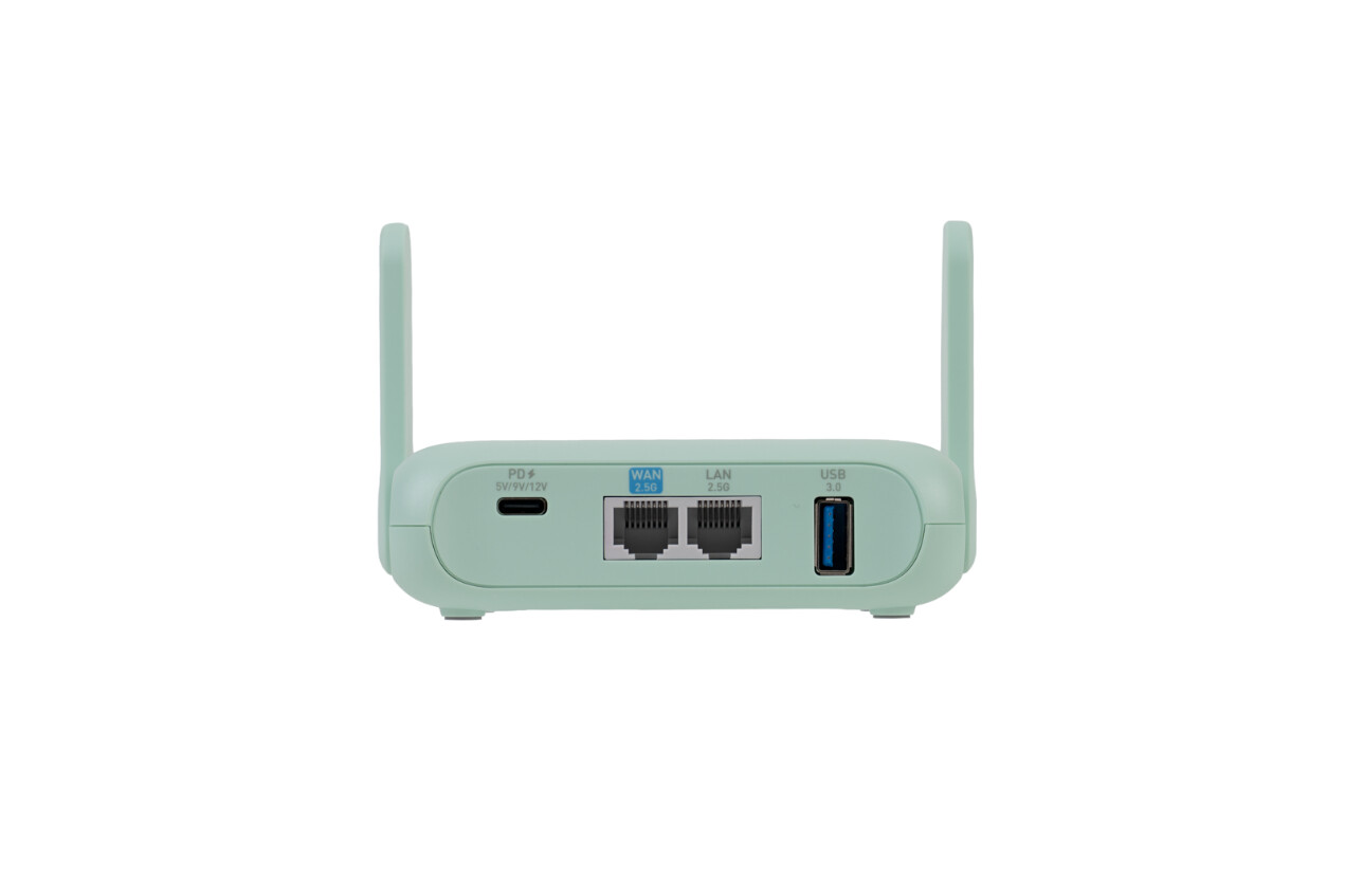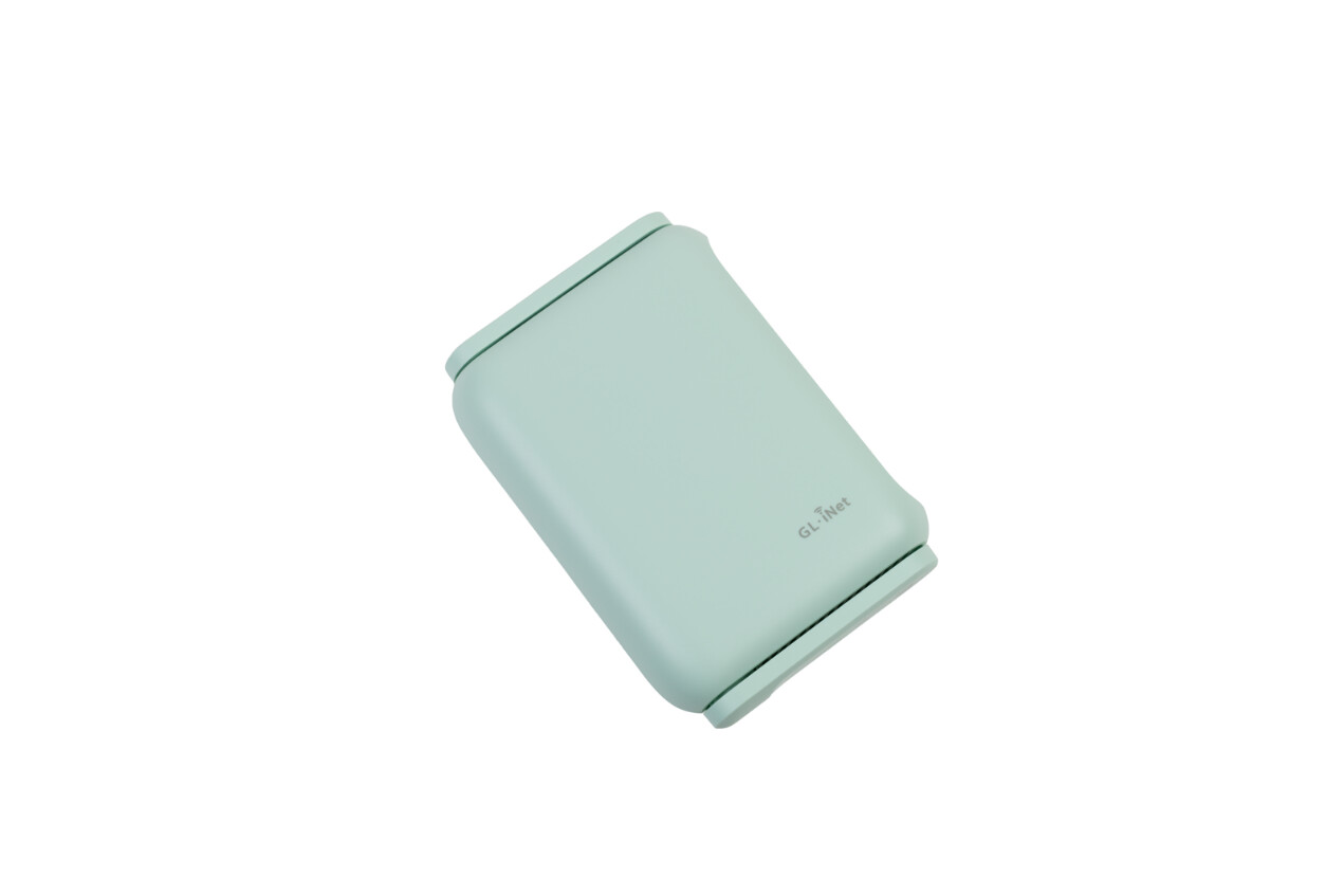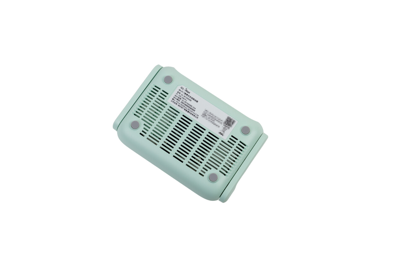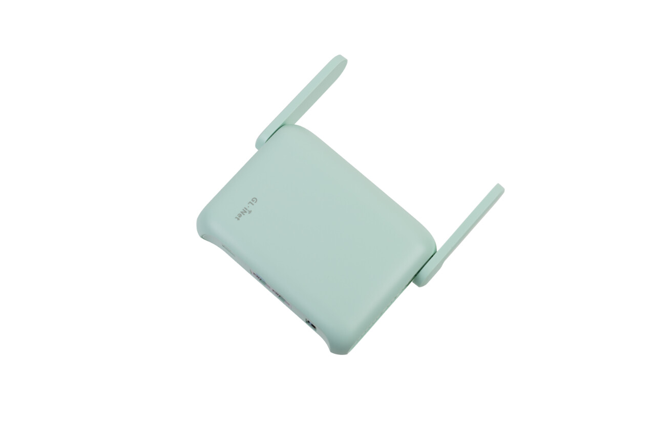 ▲顶盖处清晰印有GL.iNet的品牌 Logo,机身采用柔和的浅薄荷绿配色,质感简洁清爽。机身配备2根可折叠外置WiFi天线,收纳时能与机身保持平齐,进一步提升便携性,展开后则能有效增强信号覆盖范围。