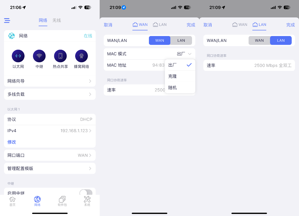 ▲网口管理中可以对WAN口的MAC模式进行设定,支持克隆MAC,网口速率最高支持2.5Gbps。